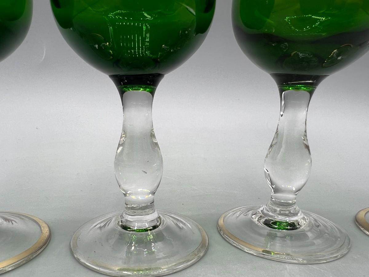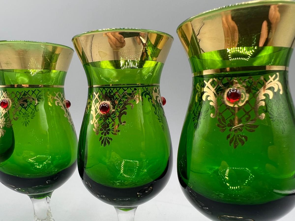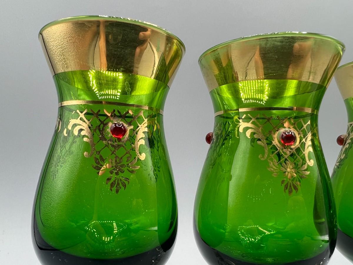 Vintage Green and Gold Drink Stemware Cordial Glasses. In overall good condition. Rhinestone accent. Some light wear to the gold. About 6" size.