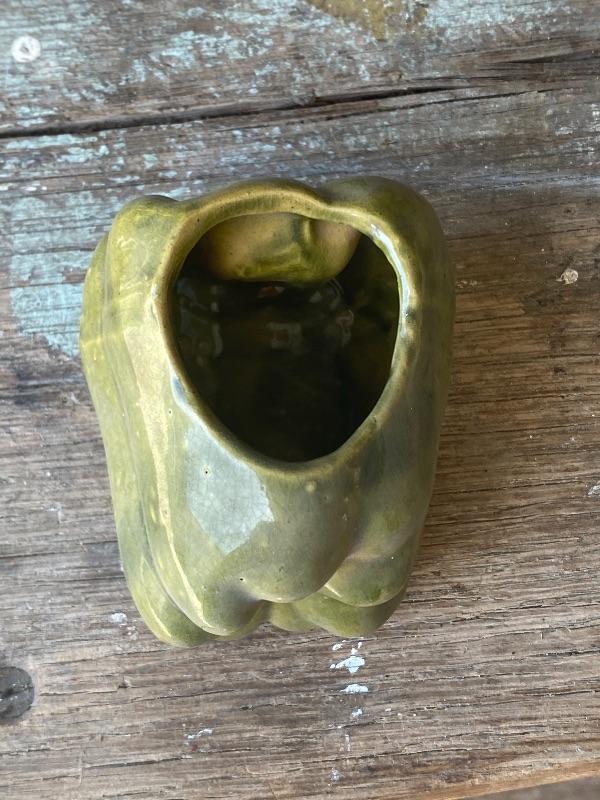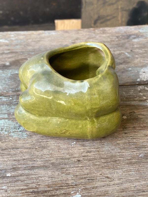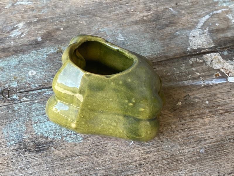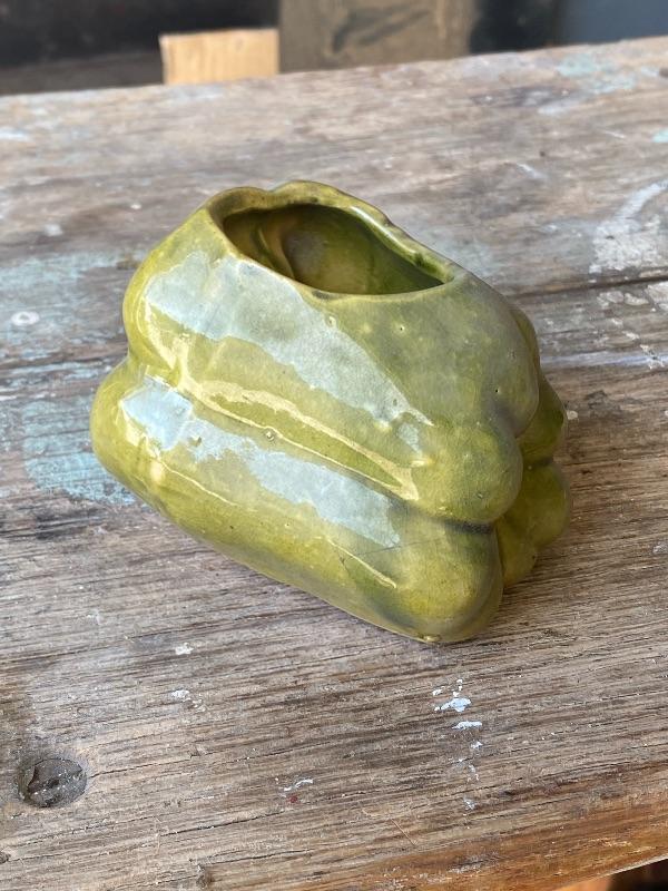 Vintage green bell pepper planter. Small under 5". No chips, light crazing. No maker mark.