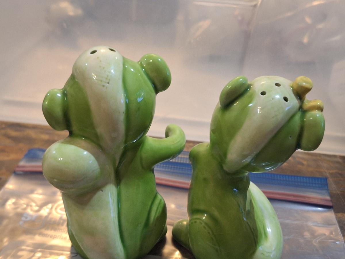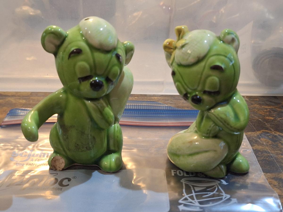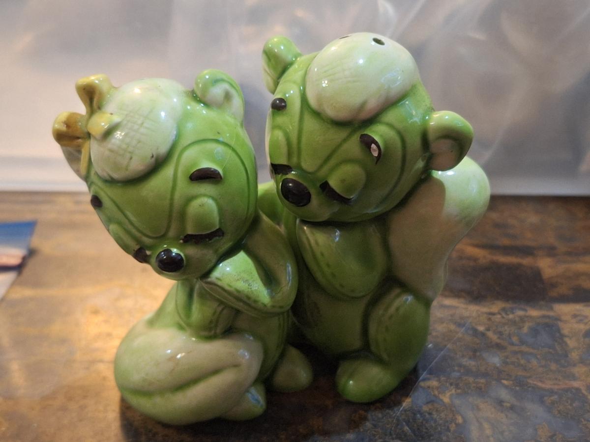 vintage green ceramic Van Tellingen bear salt and pepper shakers.