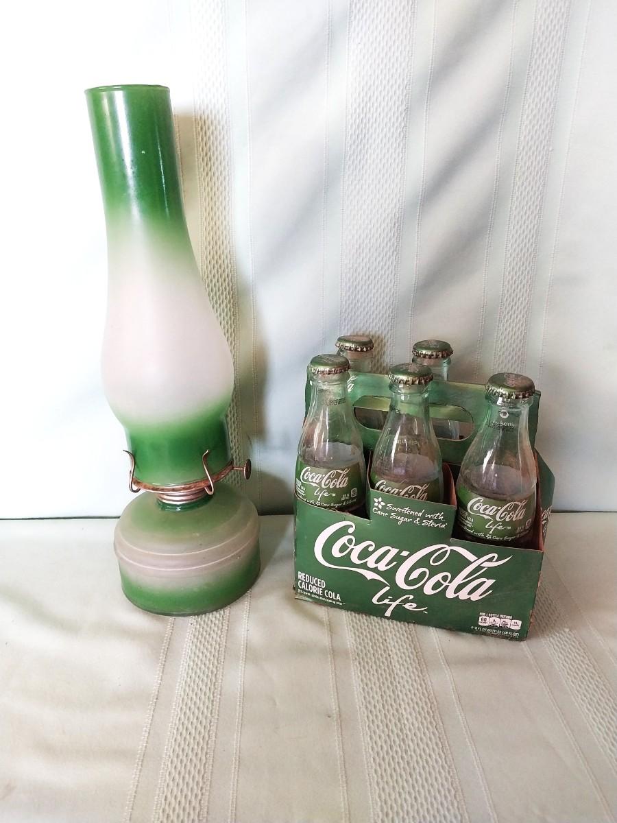 VINTAGE GREEN LABLE COKE BOTTLES AND GLASS OIL LAMP