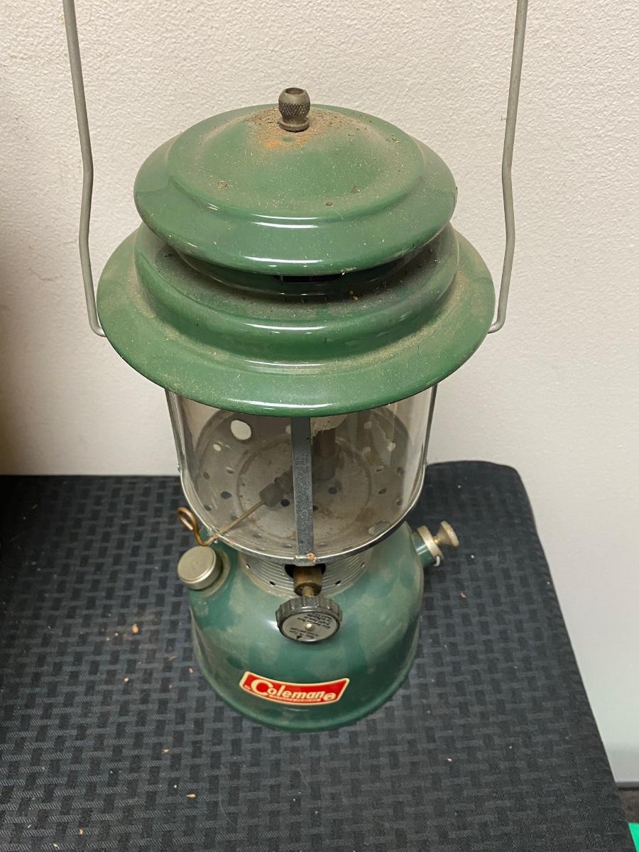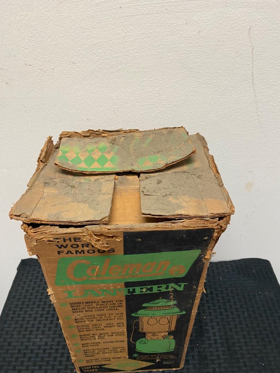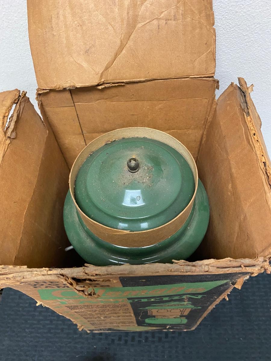 Vintage green gas fueled Coleman lantern. In good previously used condition. Has original box, it is worn and brittle. There does seem to be some rust possibly in fuel tank but no signs of rust on the outside. See photos