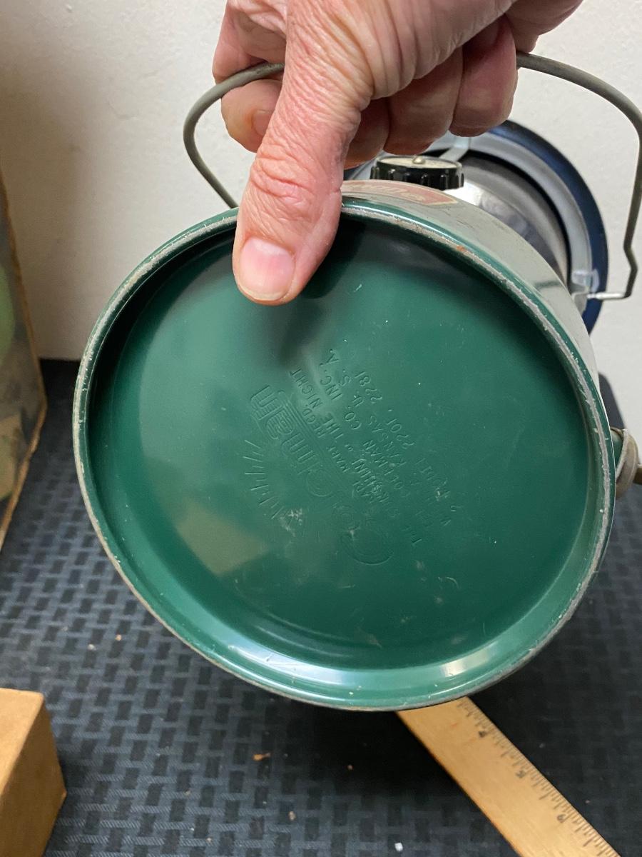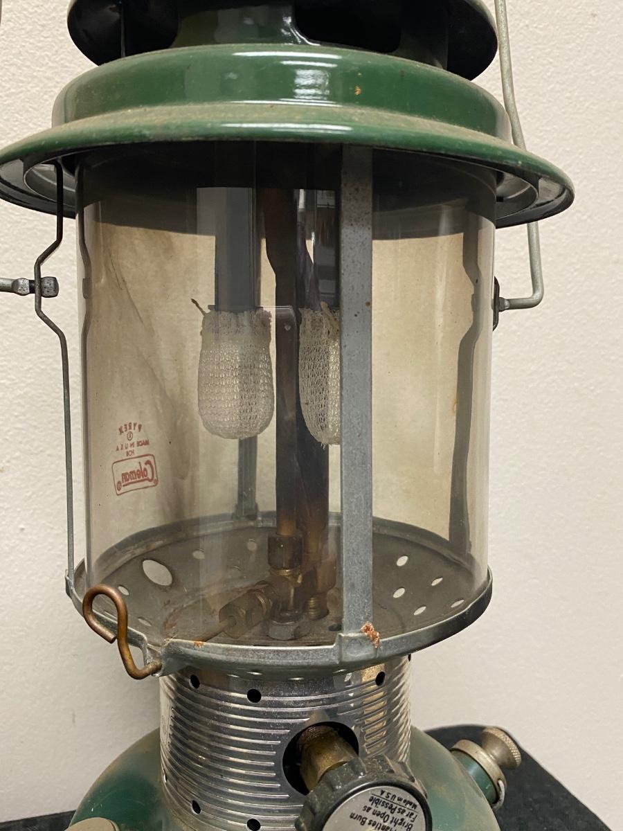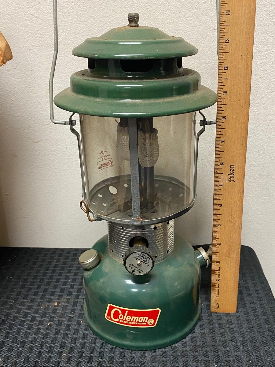 Vintage green gas fueled Coleman lantern. In good previously used condition. Has original box, it is worn and brittle. There does seem to be some rust possibly in fuel tank but no signs of rust on the outside. See photos