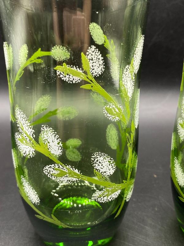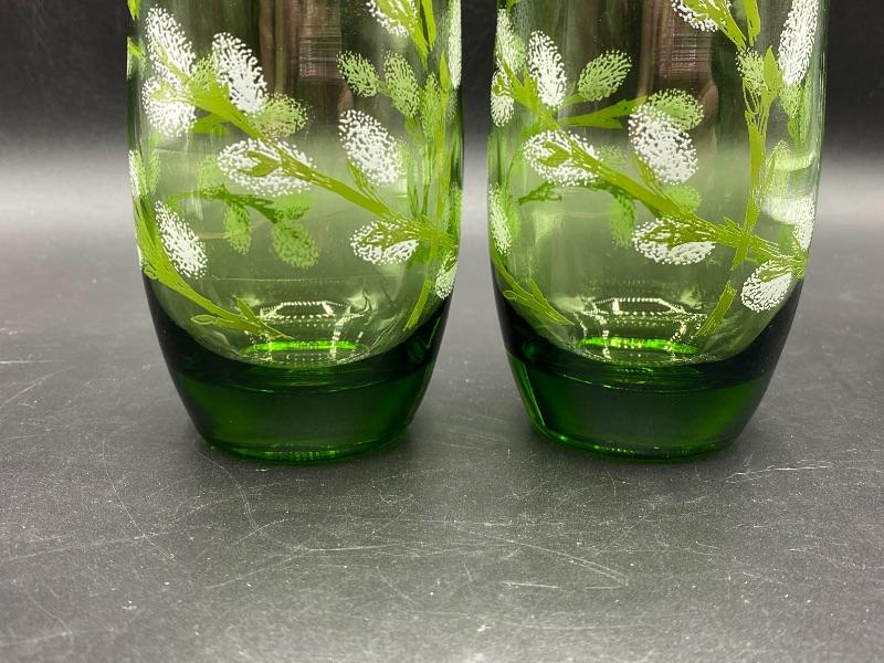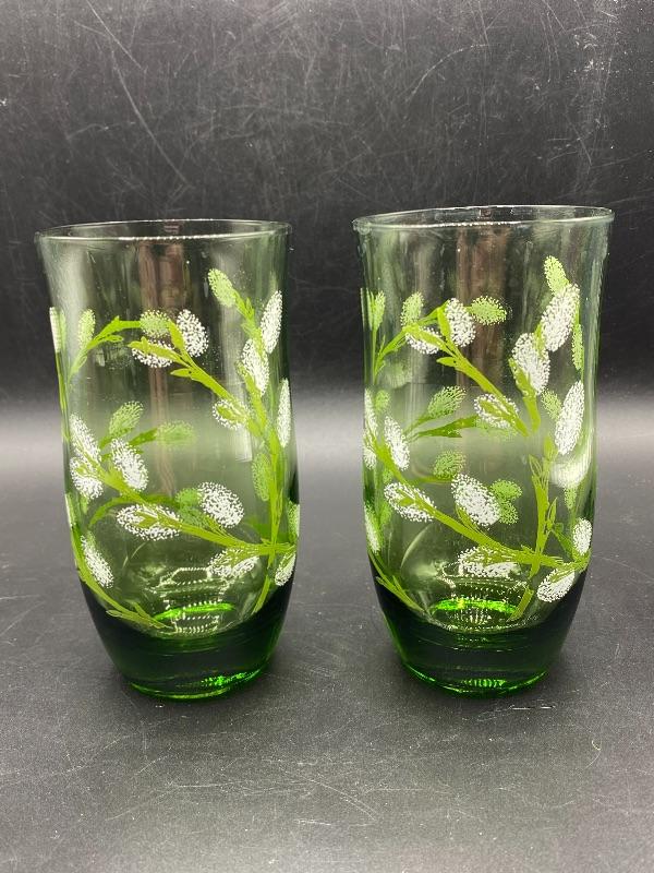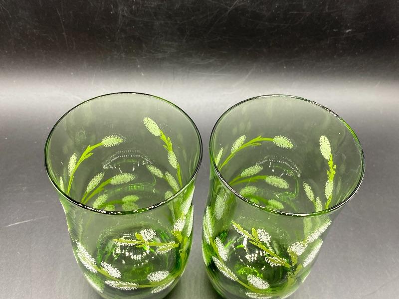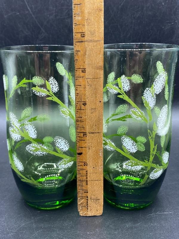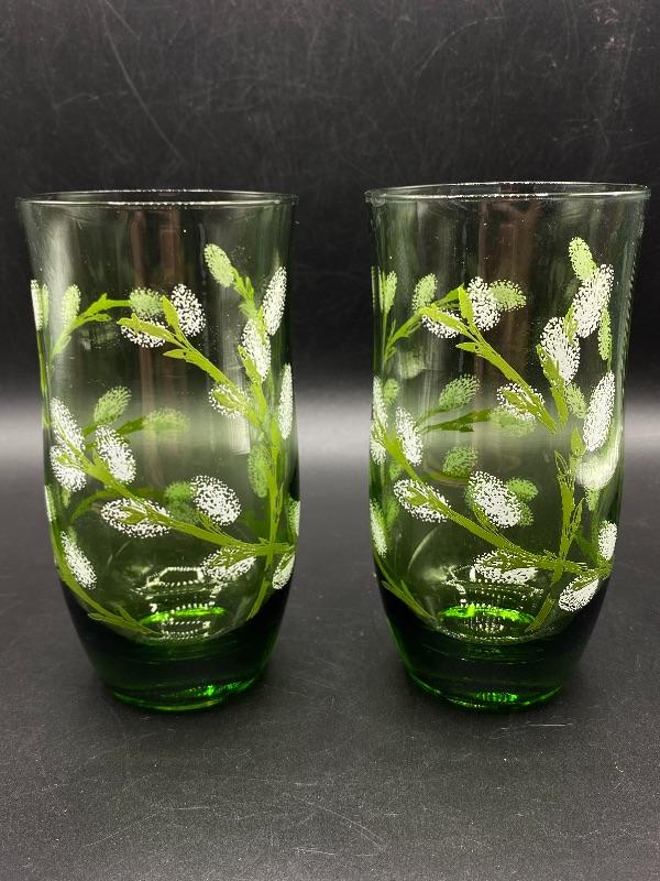 Pair of vintage green drinking glasses with a cotton willow pattern. 5.5" glasses. Heavy bottom. Good condition, no chips and the pattern looks good.