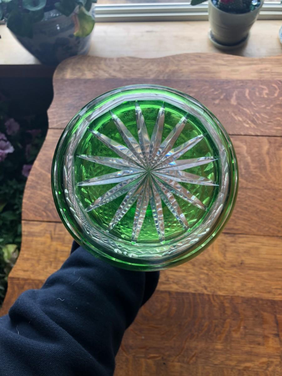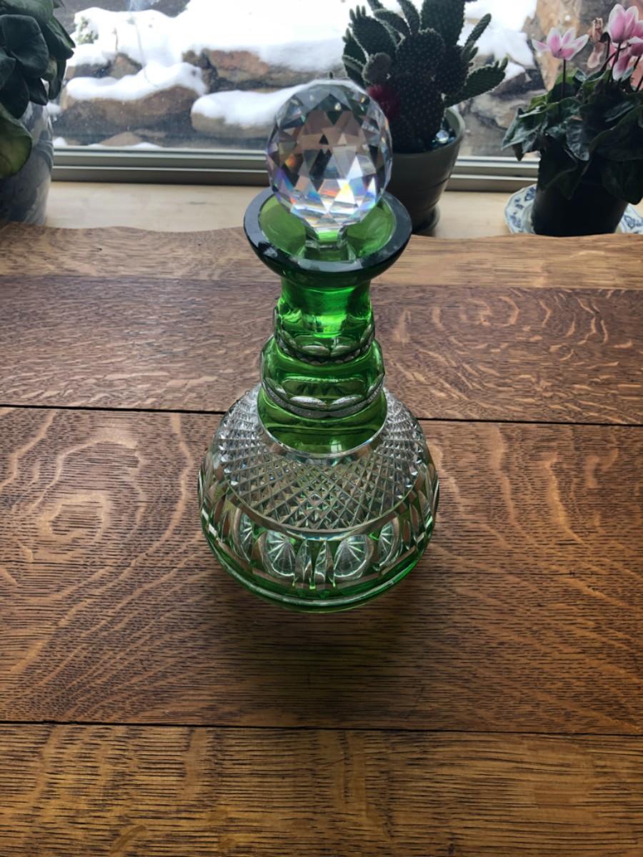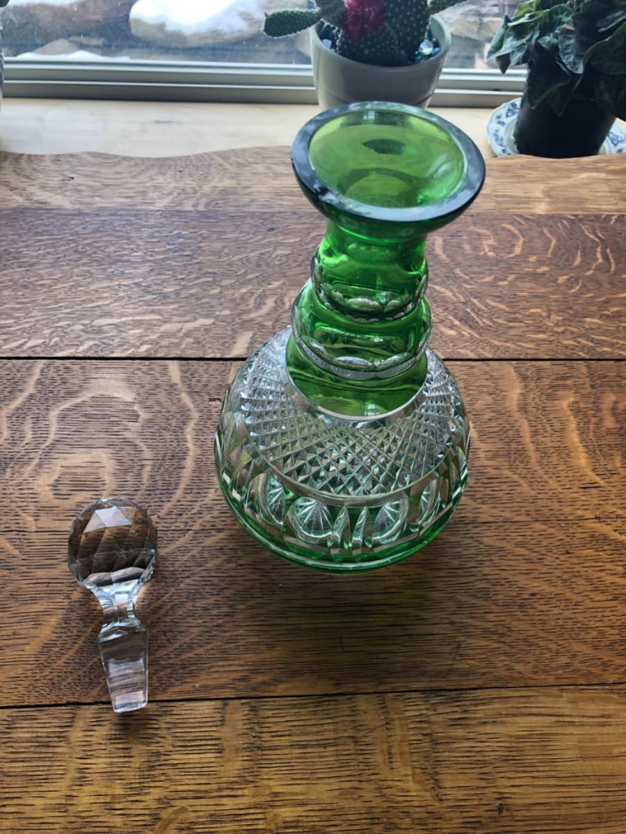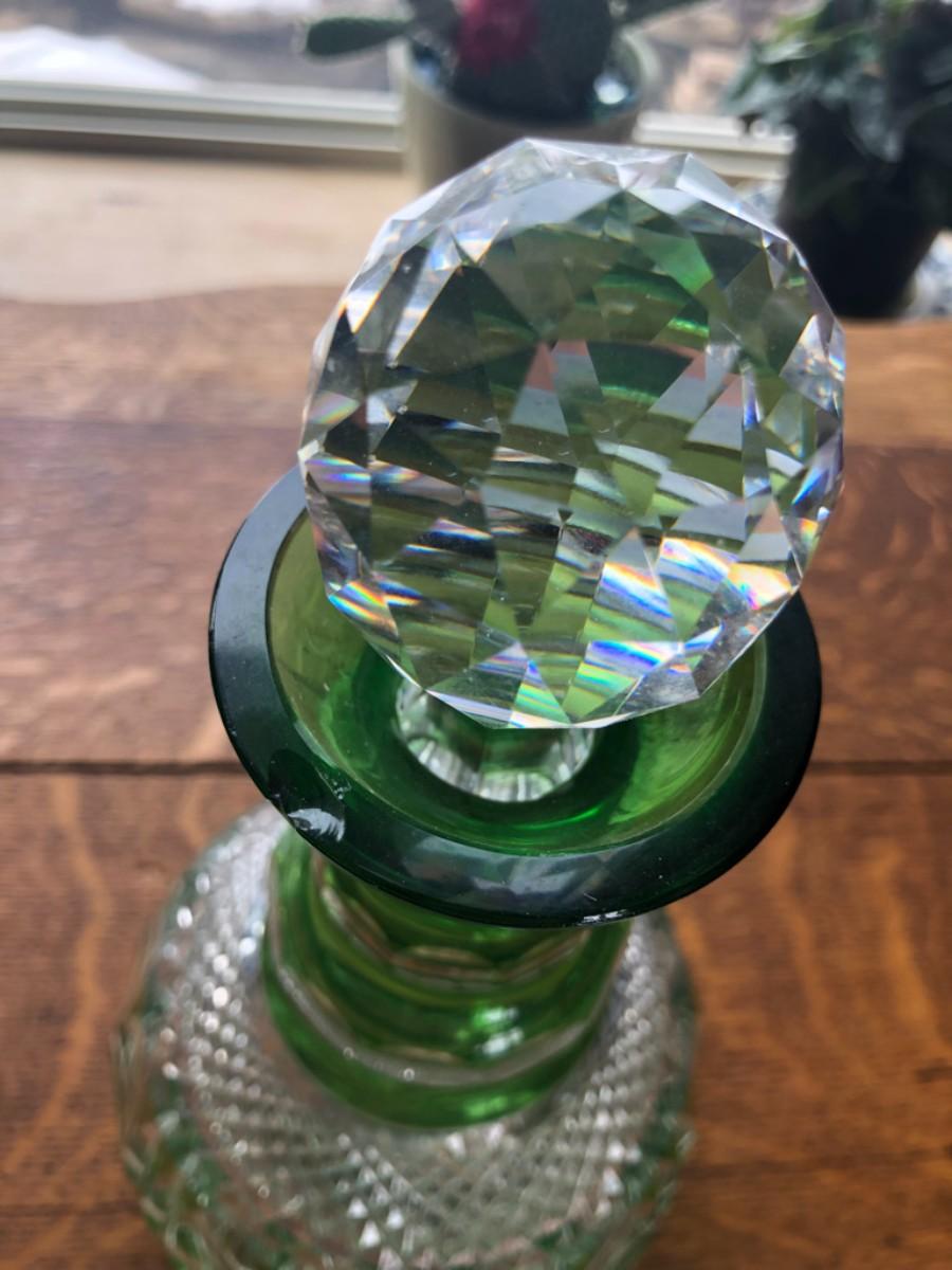 This vibrant piece is in good condition with a small chip on the rim. 11 inches tall with the stopper.