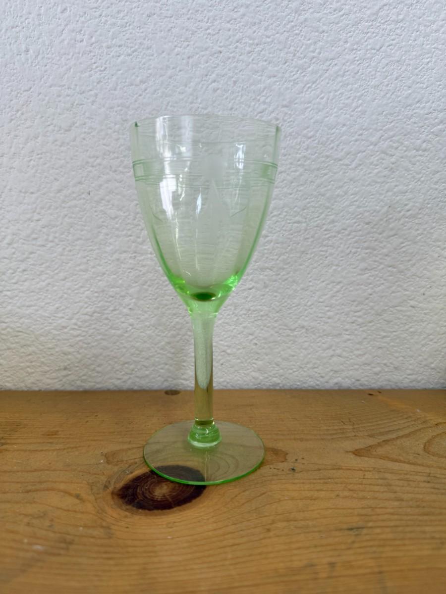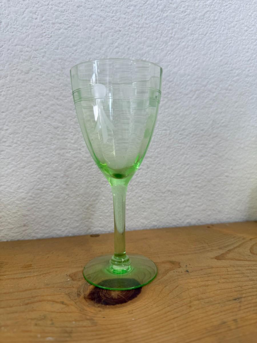A lovely vintage green depression glass set that includes various pieces, ideal for adding a touch of nostalgia to your dining experience.