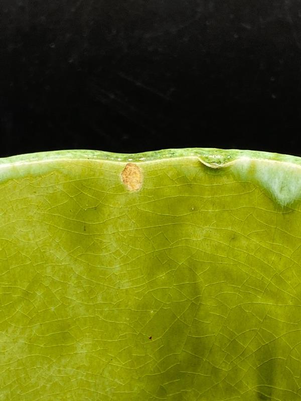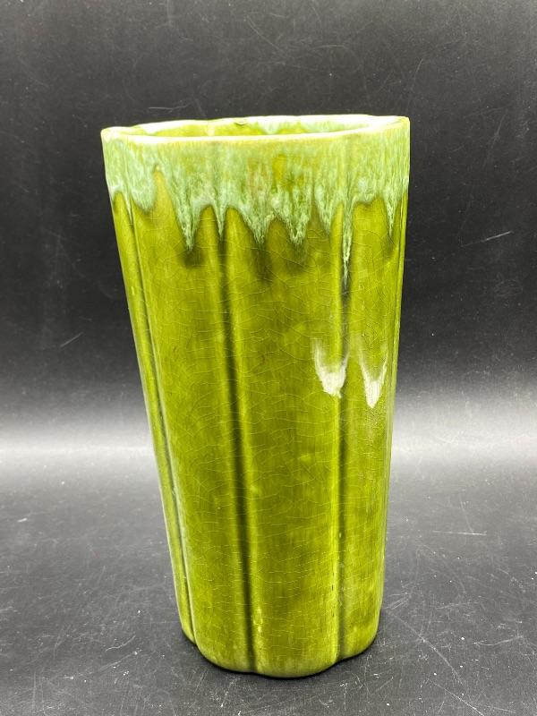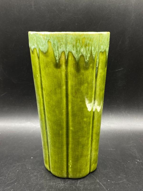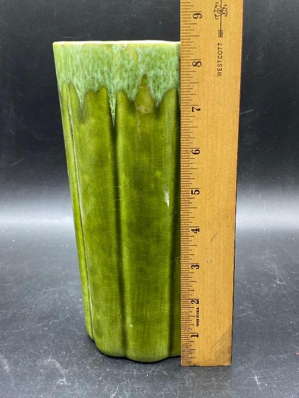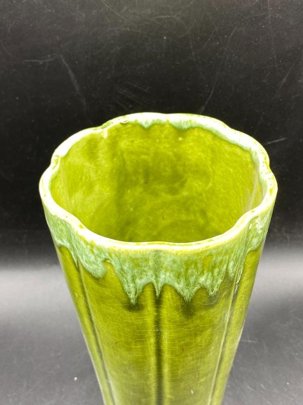 Vintage green dripware pottery vase. Unbranded. Slight scallop to the shape. There is crazing in the glaze and a small chip along the edge inside and outside. Stands 8.5" tall. Displays nicely.