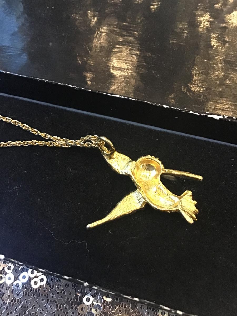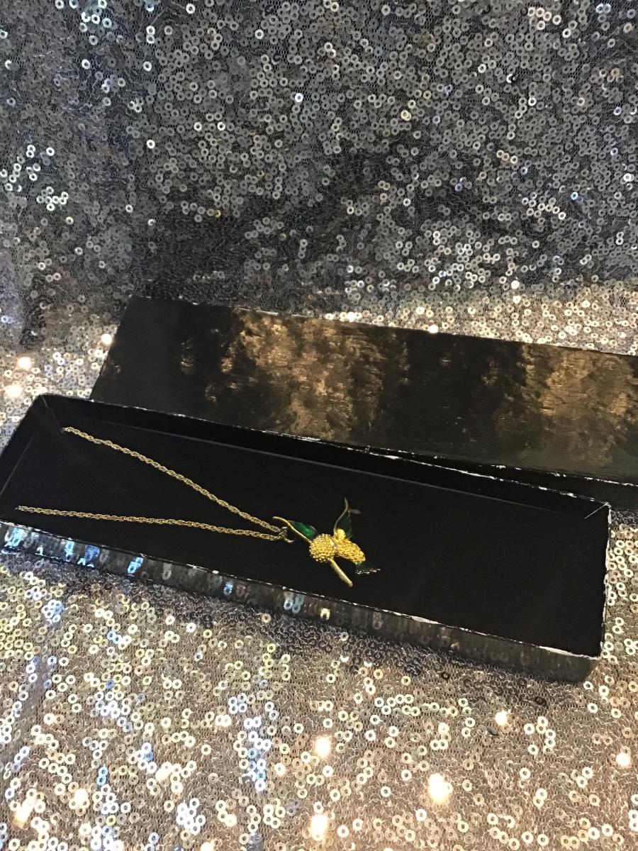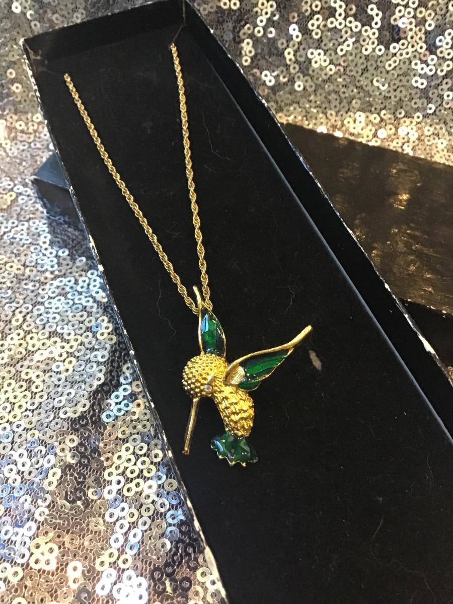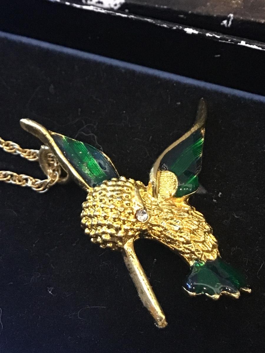 Vintage Green Enamel Hummingbird Pendant Necklace Rhinestone Eye Gold. New in Box