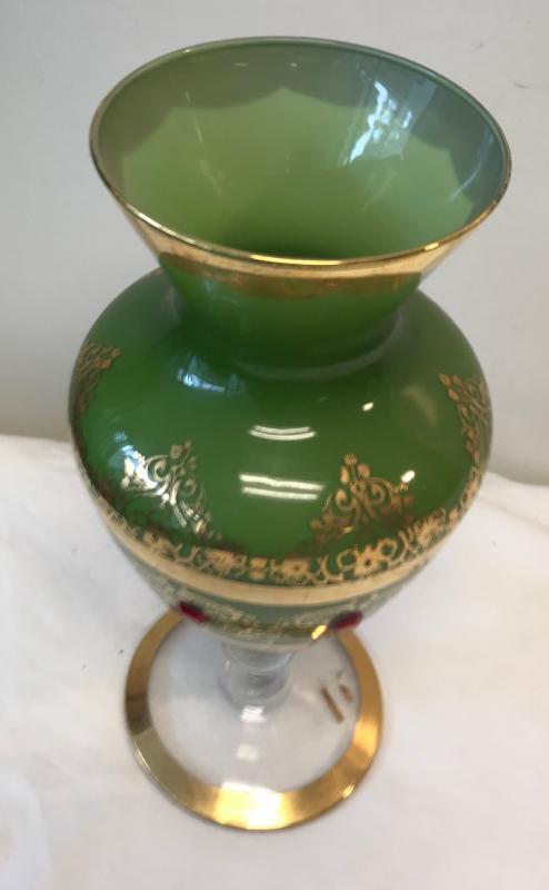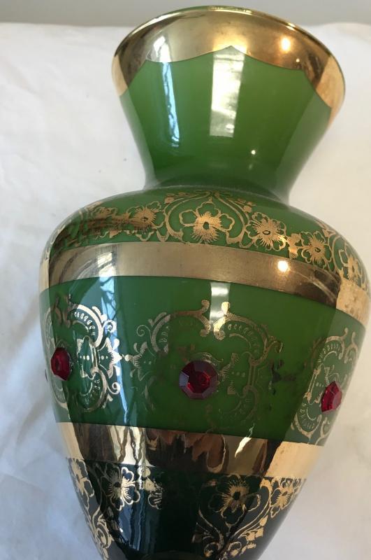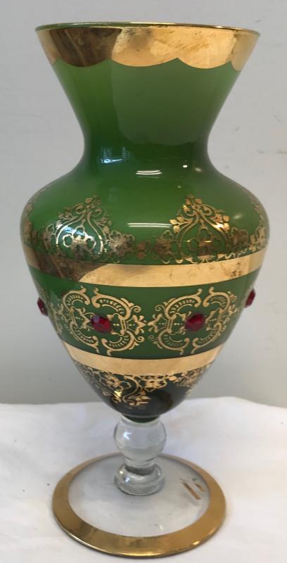 Description: Green Gilt Floral Vase. Measurement approximate: 11 H X 4.5 D. Material: Glass & Ruby like Studs. Shipping Charges: $25 Condition: Very good.