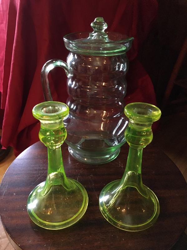 Vintage Green Glass 10.5” Pitcher with Pair if 7.5” Vaseline Glass Candle Holders. LOT 15
