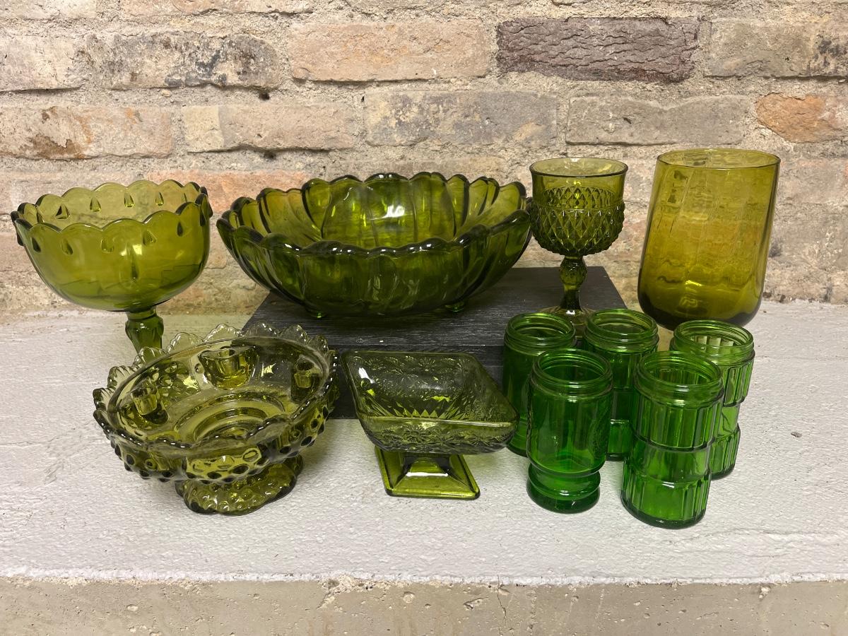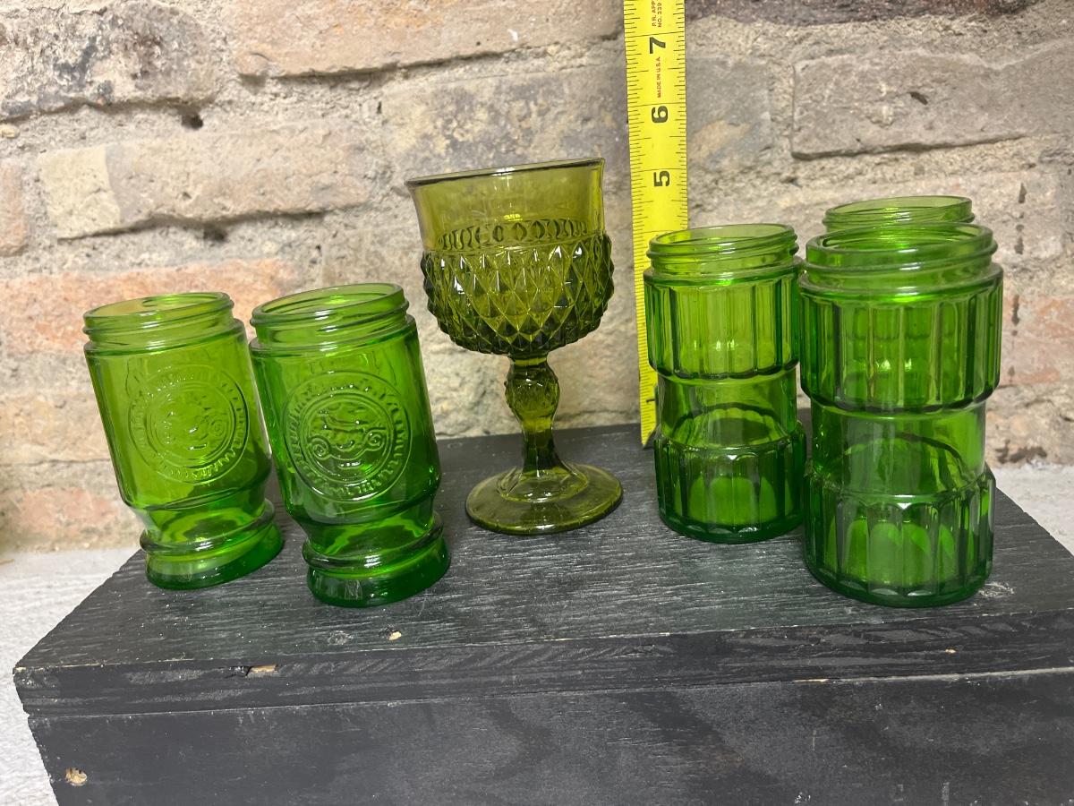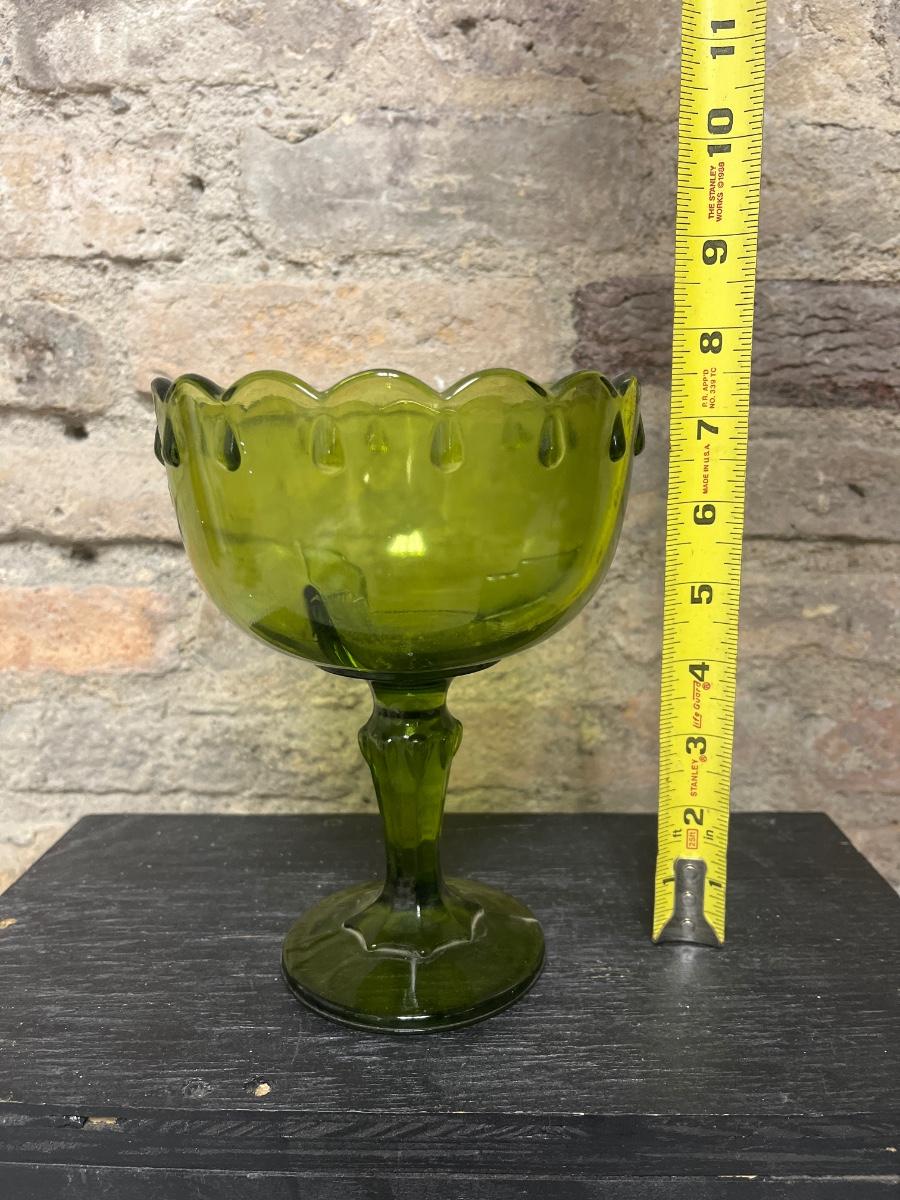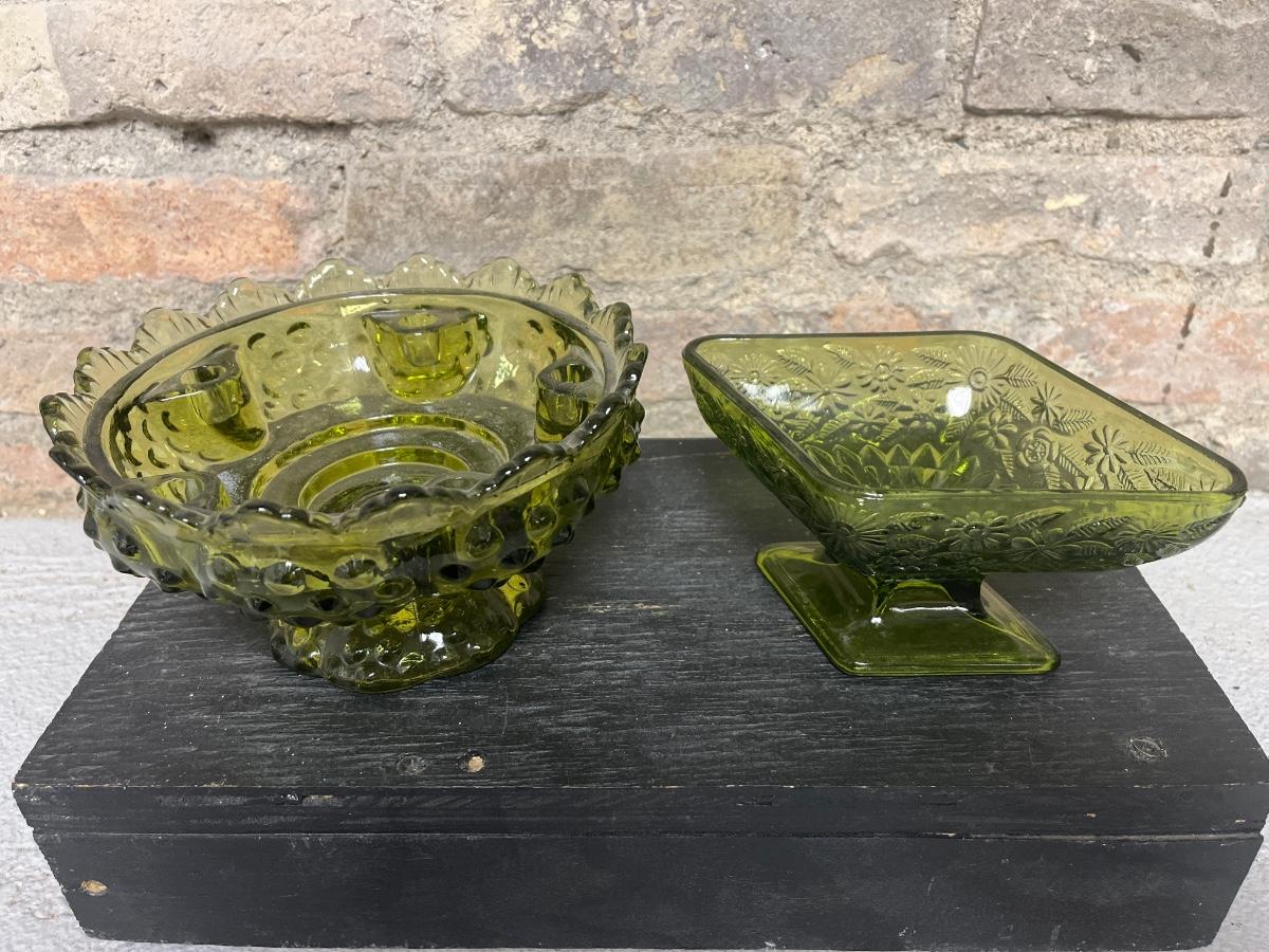 Indiana Glass footed serving bowl, footed glass candy dish, single water goblet and scalloped pedestal compote. Five Wheaton spice jars without lids in two different patterns, Optic Empoli style pedestal vase and Fenton hobnail candlestick bowl