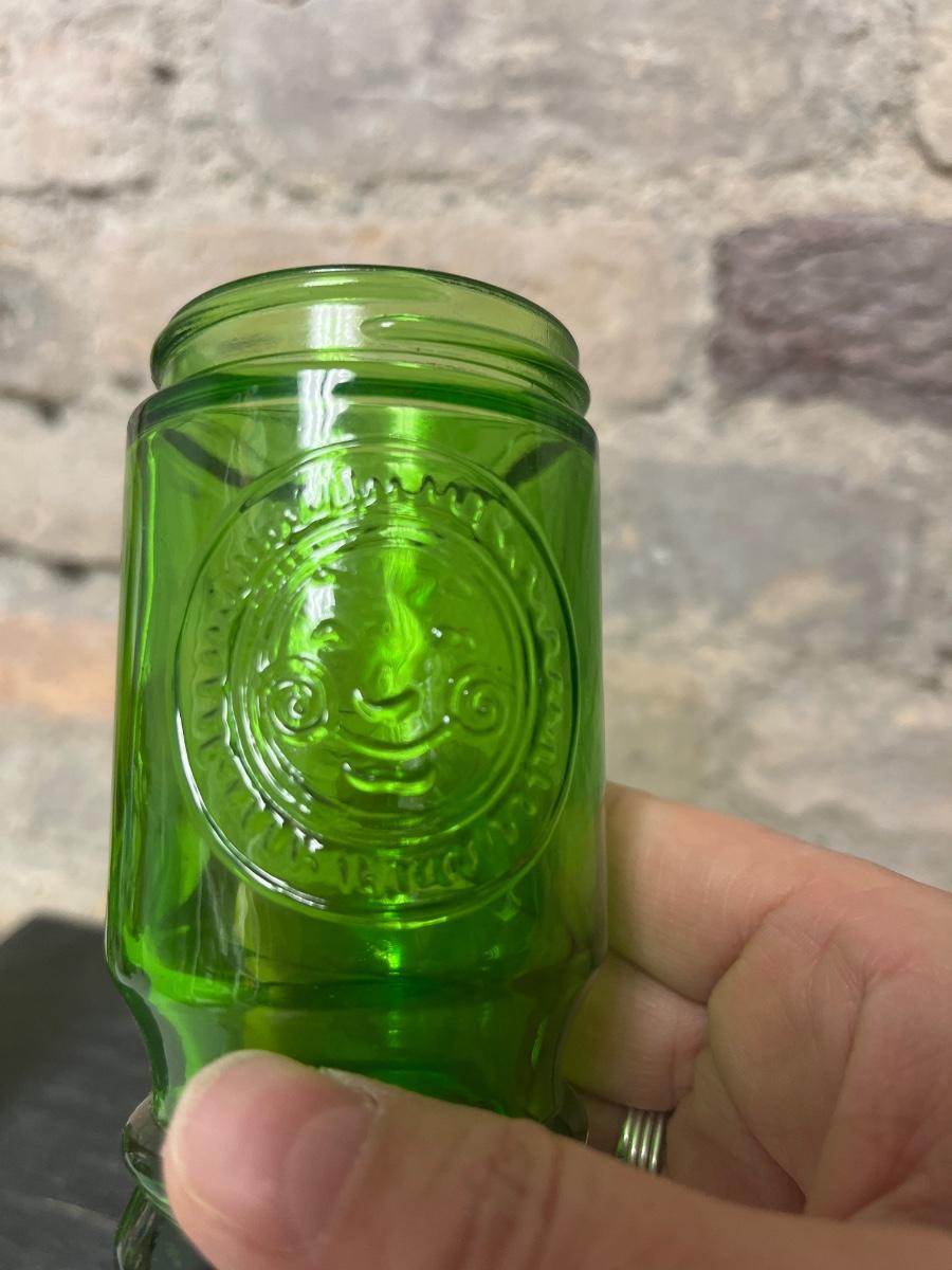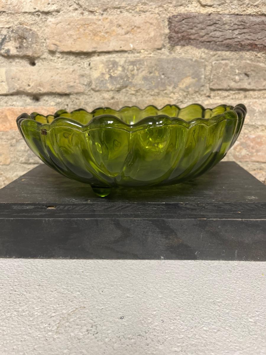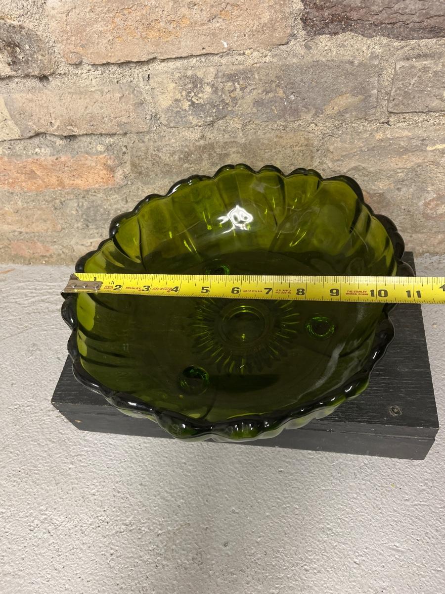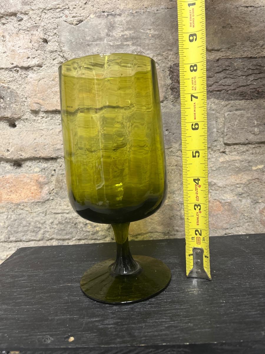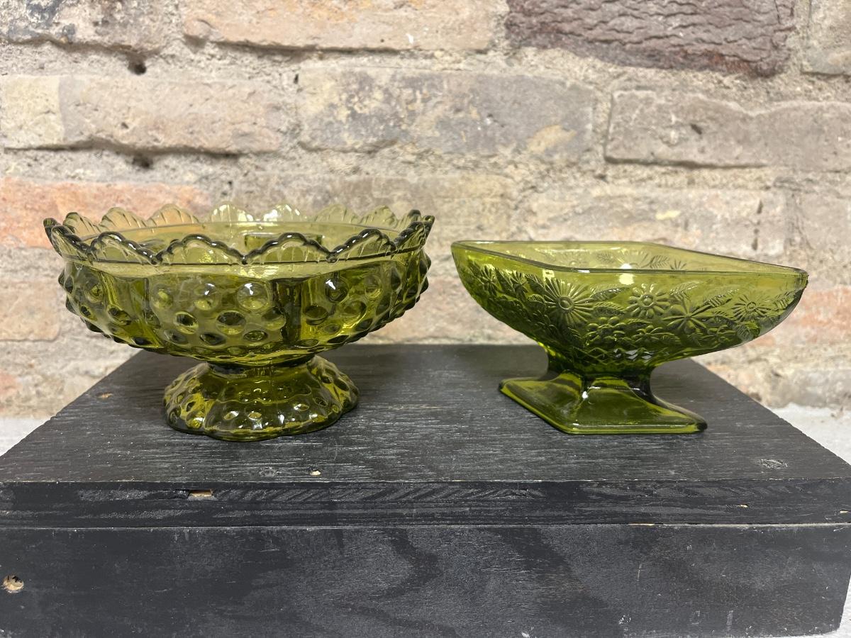 Indiana Glass footed serving bowl, footed glass candy dish, single water goblet and scalloped pedestal compote. Five Wheaton spice jars without lids in two different patterns, Optic Empoli style pedestal vase and Fenton hobnail candlestick bowl