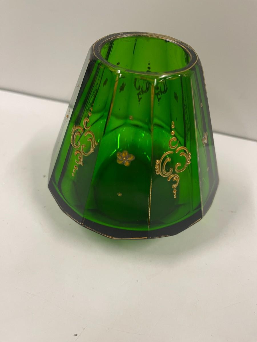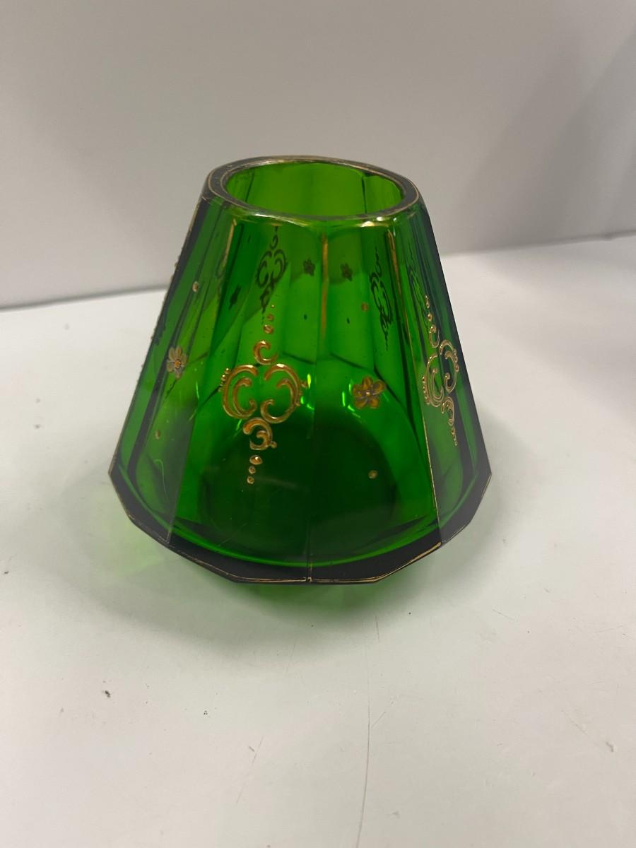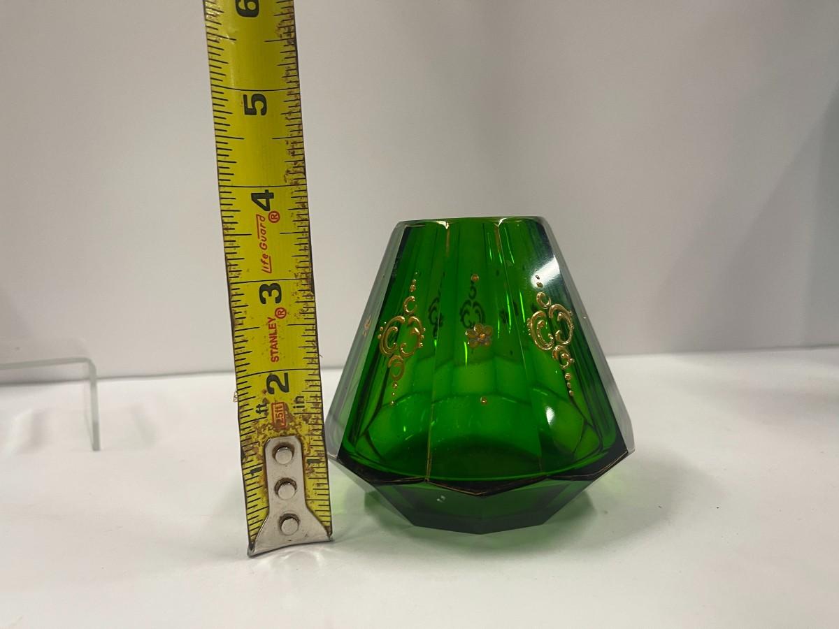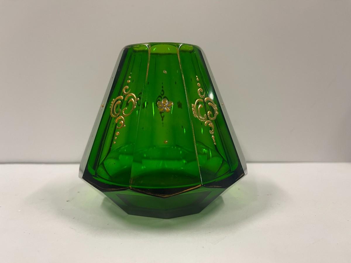 Vintage Green Glass Diamond Shaped Vase with Gold Embellishments. Has a couple of tiny chips. Some of the gold is worn.