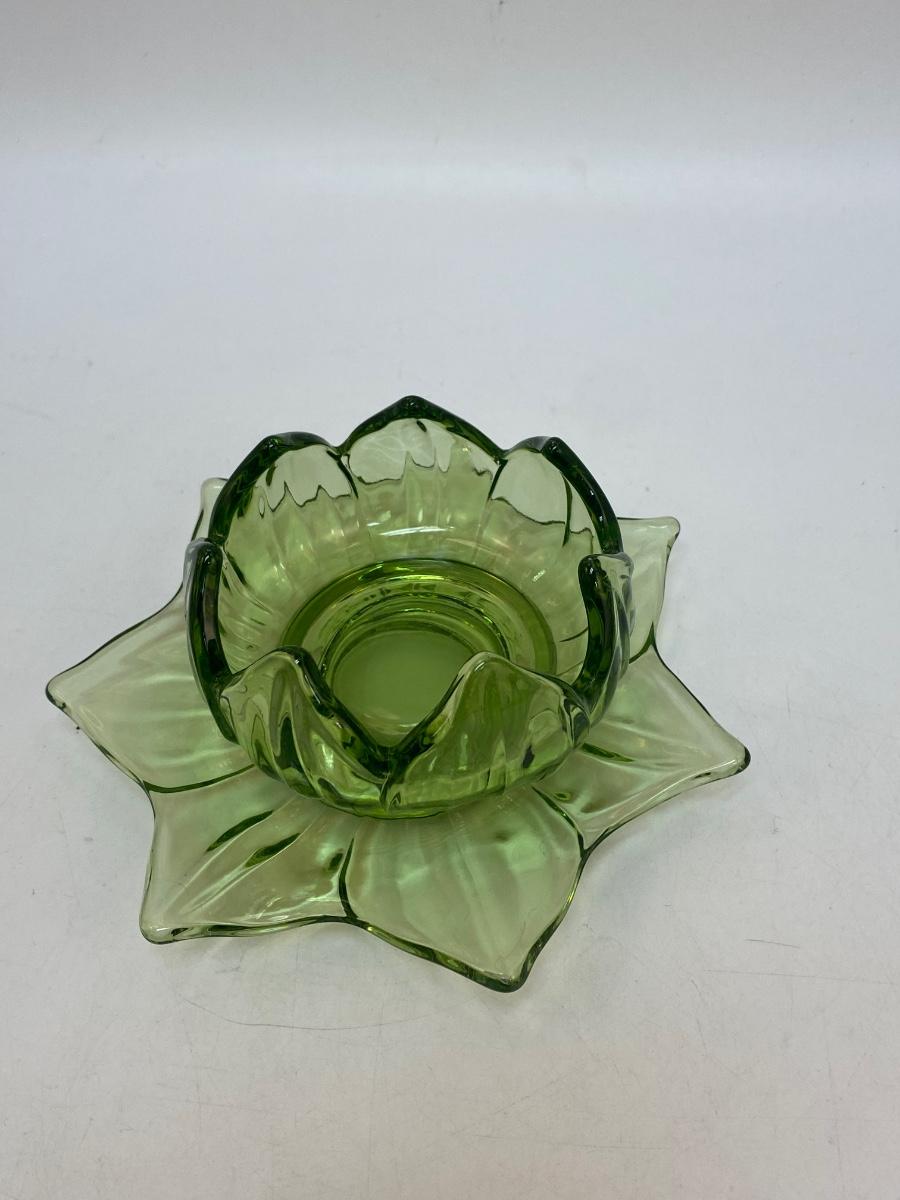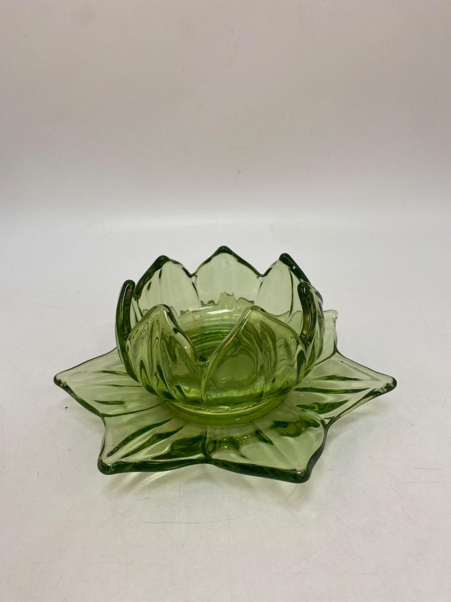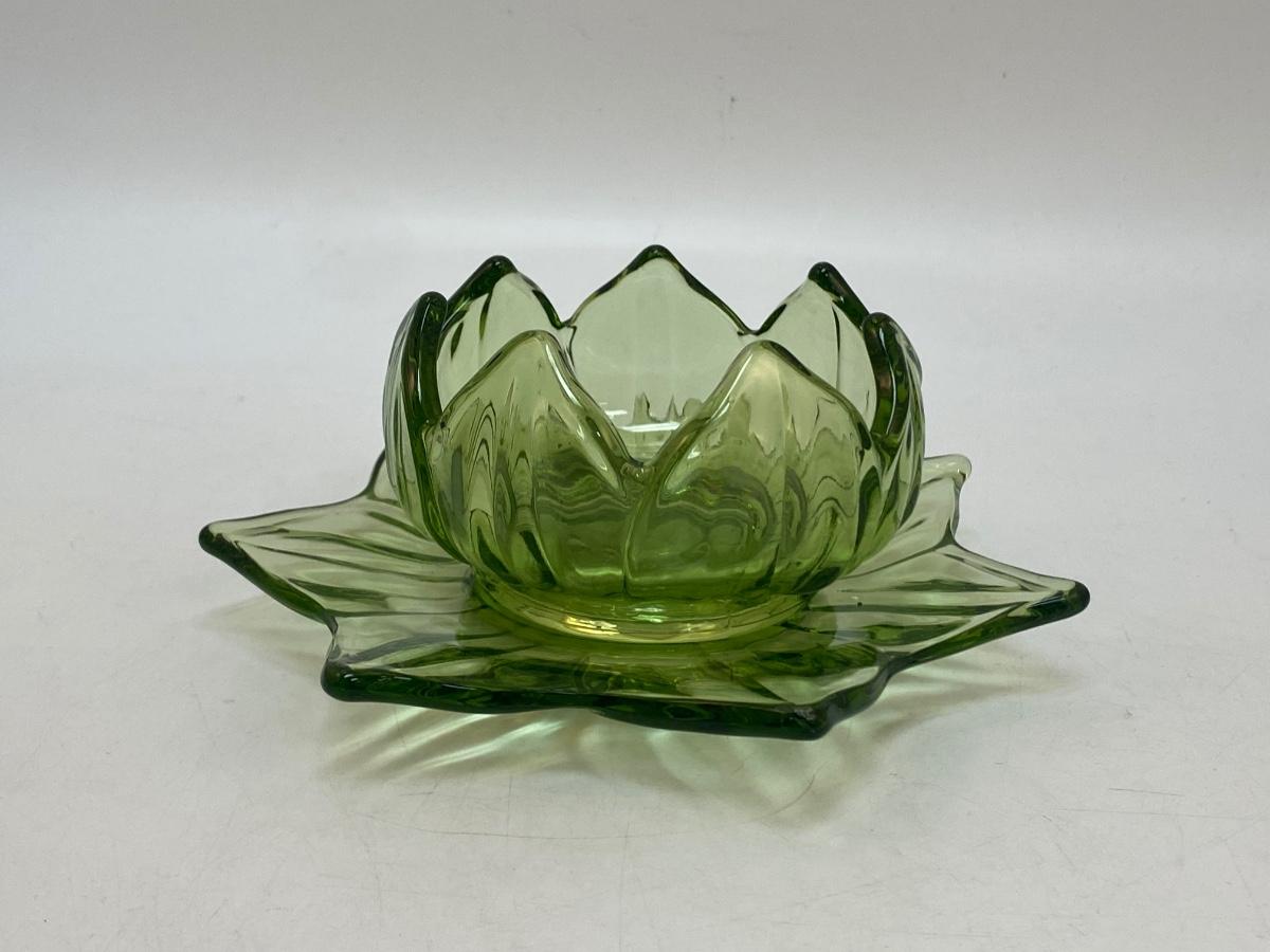 Vintage Green Glass Lotus Flower Two Piece Candy Nut Condiment Dish Bowl and Saucer. Displays nicely. In good condition.
