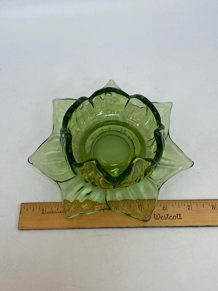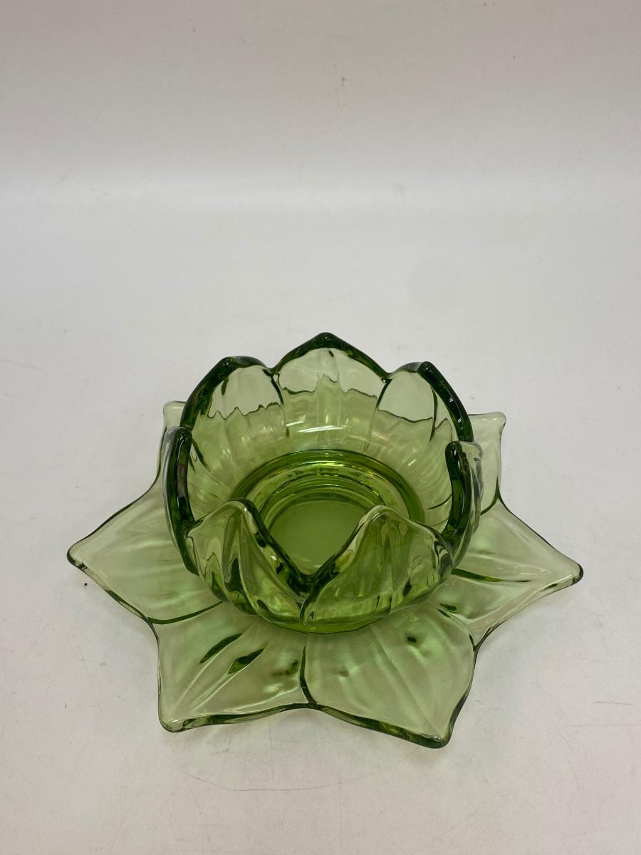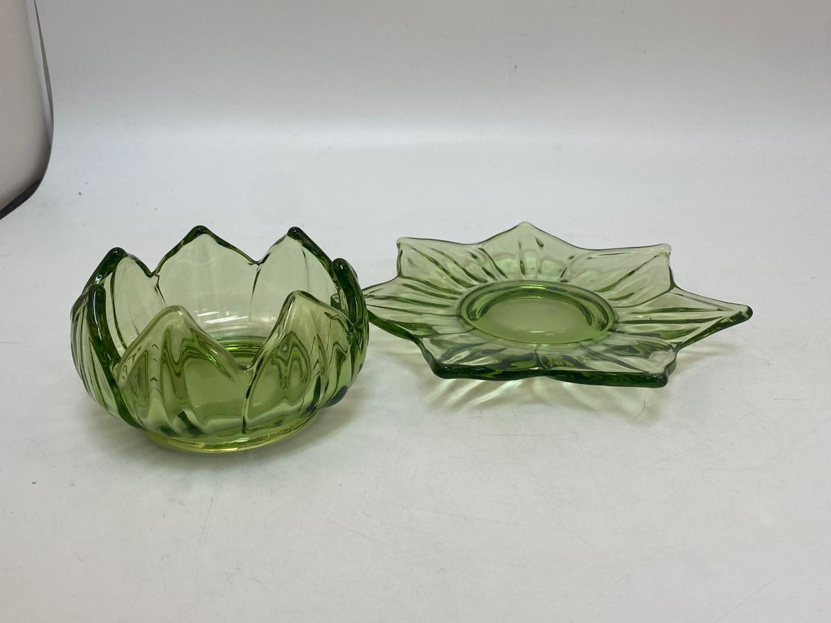 Vintage Green Glass Lotus Flower Two Piece Candy Nut Condiment Dish Bowl and Saucer. Displays nicely. In good condition.