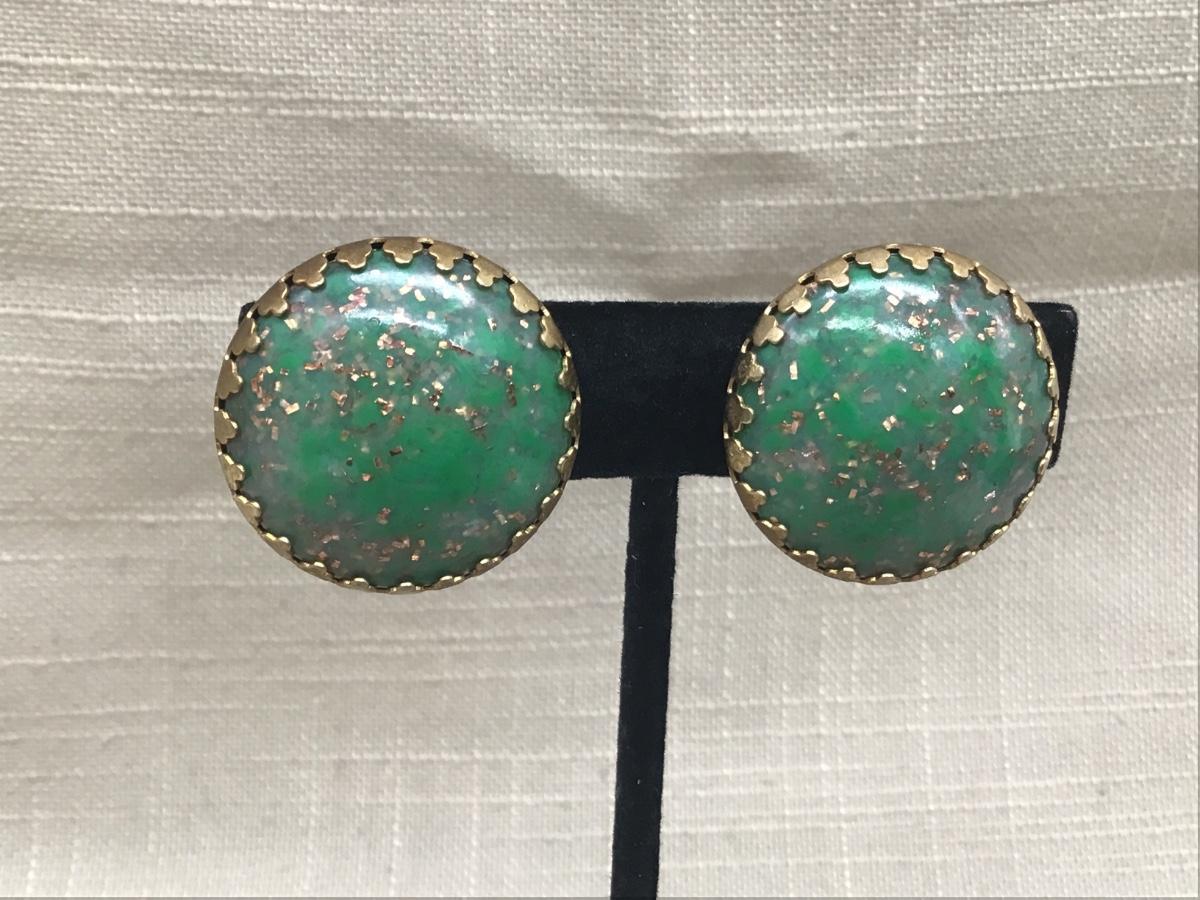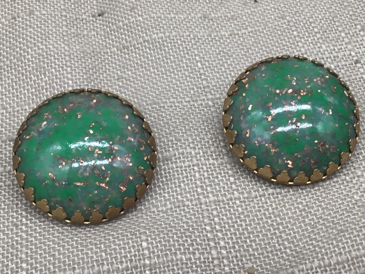 Vintage Green Gold Confetti Glitter Lucite Dome Clip on Earrings