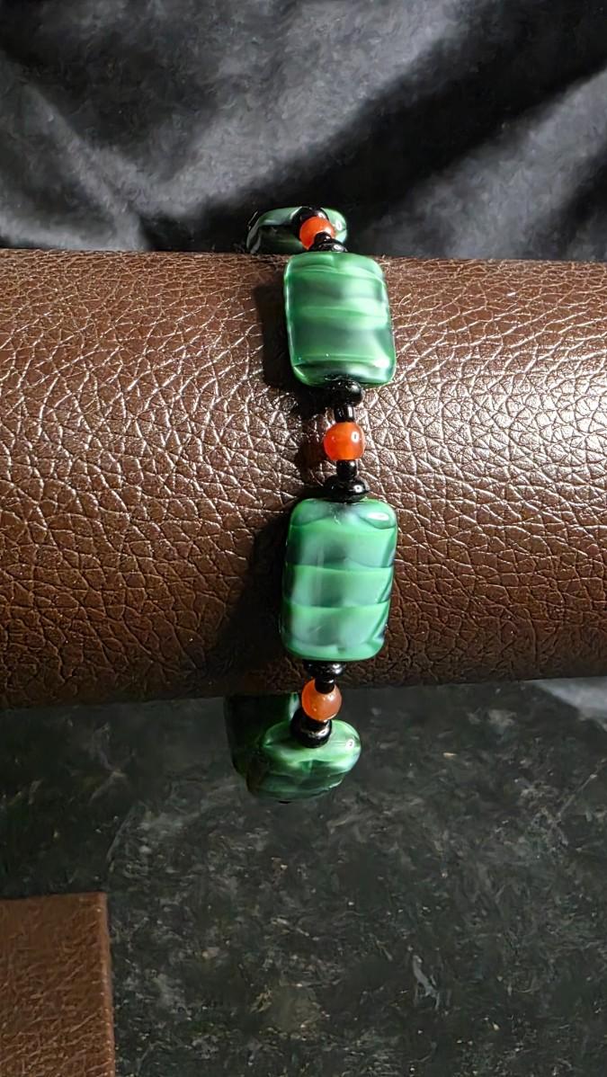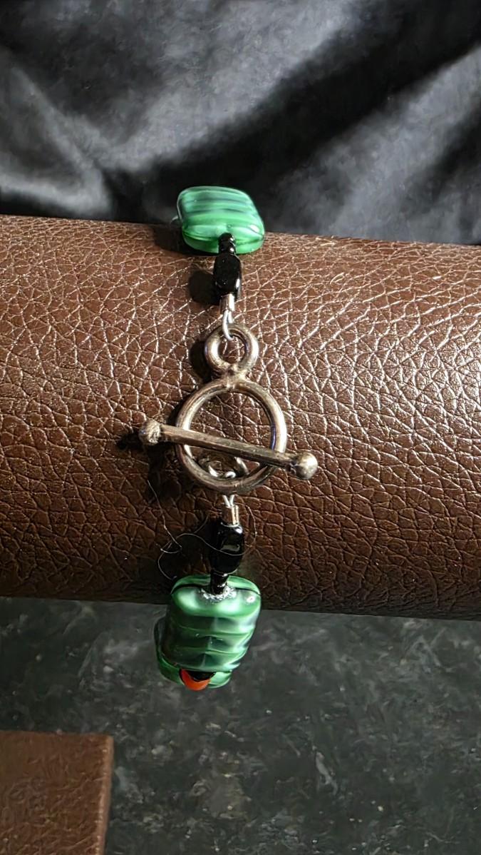 Vintage Green Marbled Glass Bead Bracelet - Silver Toggle Clasp with Black & Orange Accents