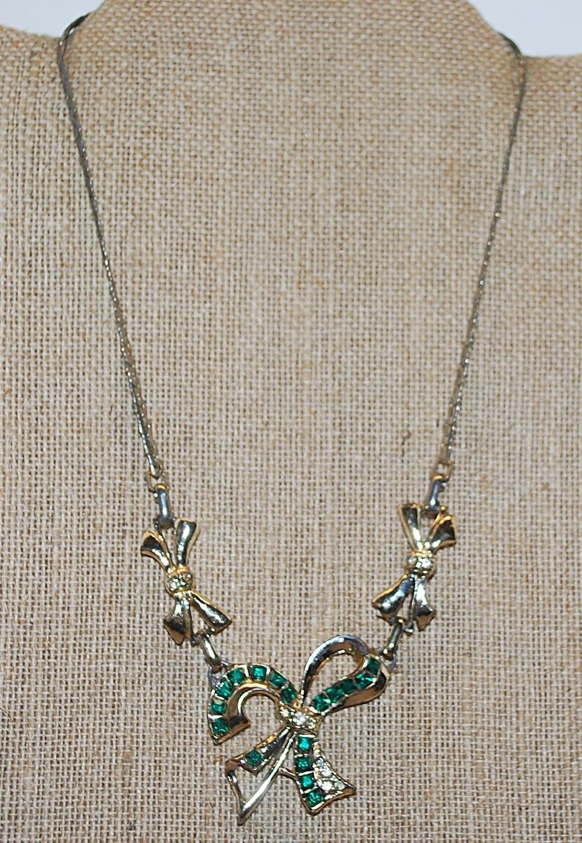 VINTAGE GREEN SQUARE Stones BOW PENDANT (1½" x 1½") with 2 Jeweled Smaller Bows on a "Snakeskin" Necklace Chain 13" L