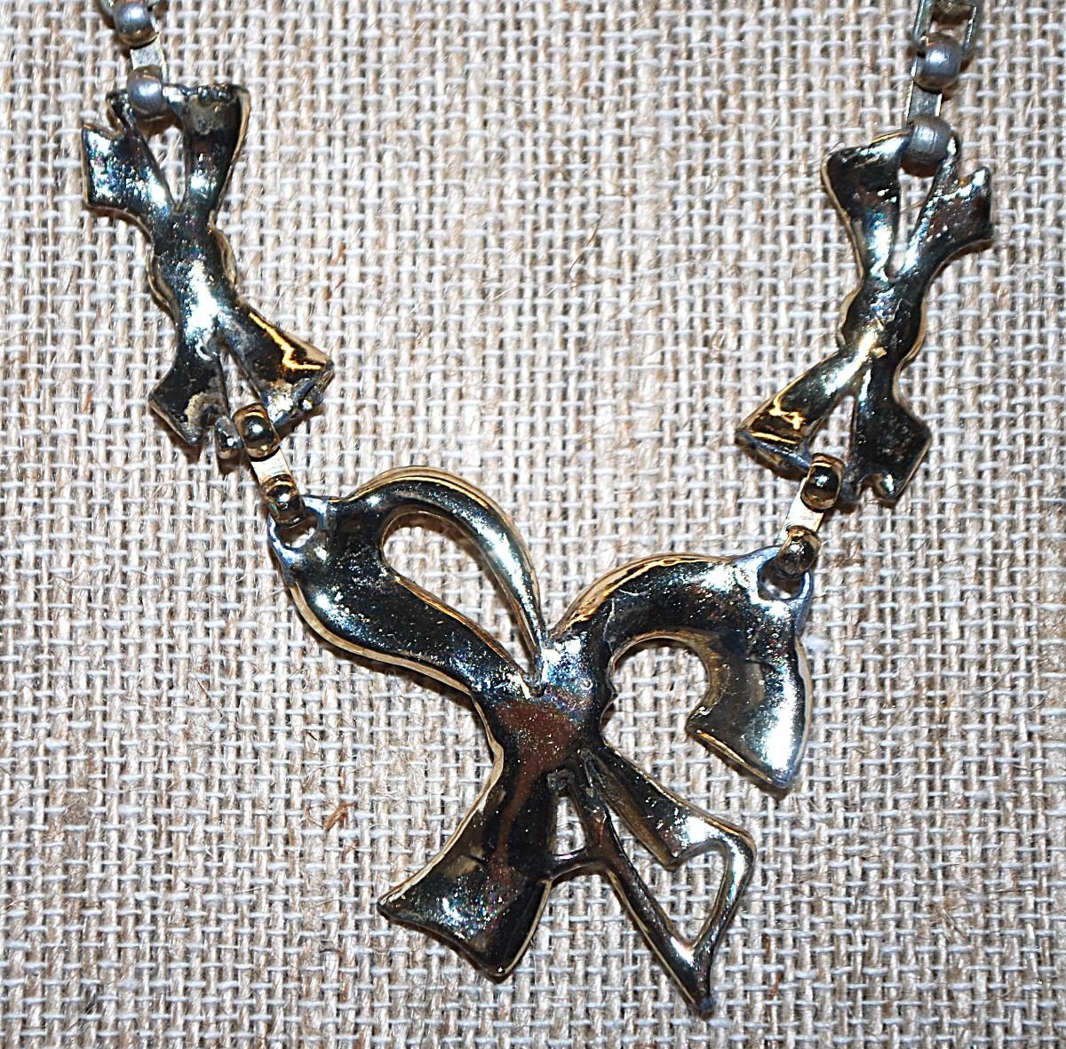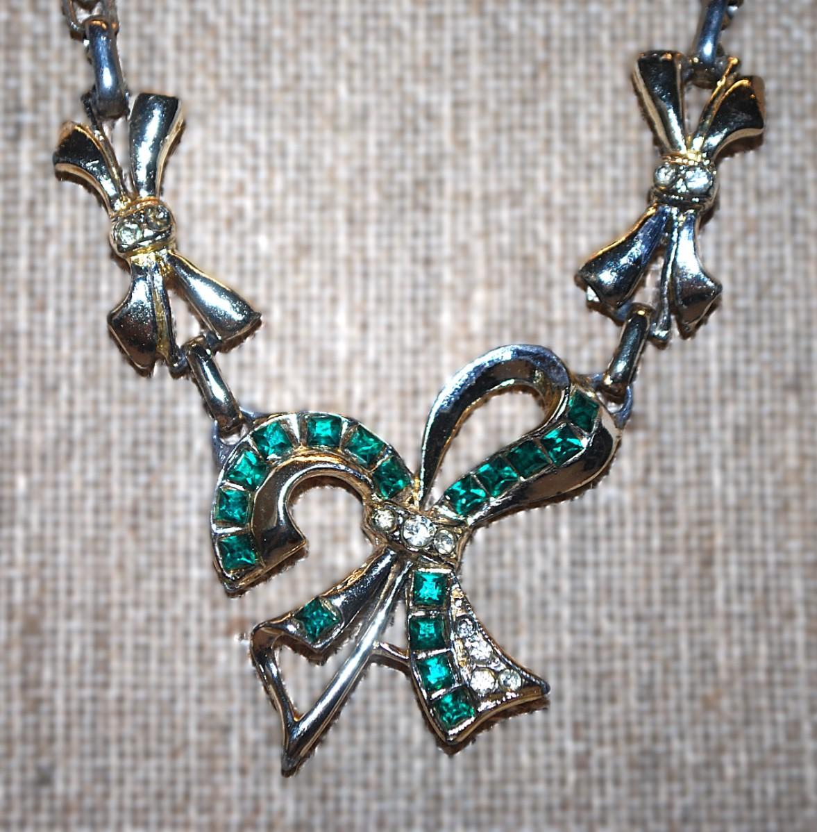 VINTAGE GREEN SQUARE Stones BOW PENDANT (1½" x 1½") with 2 Jeweled Smaller Bows on a "Snakeskin" Necklace Chain 13" L