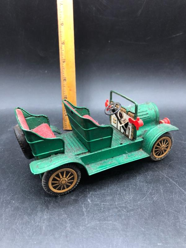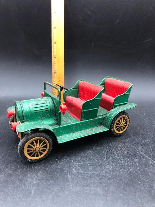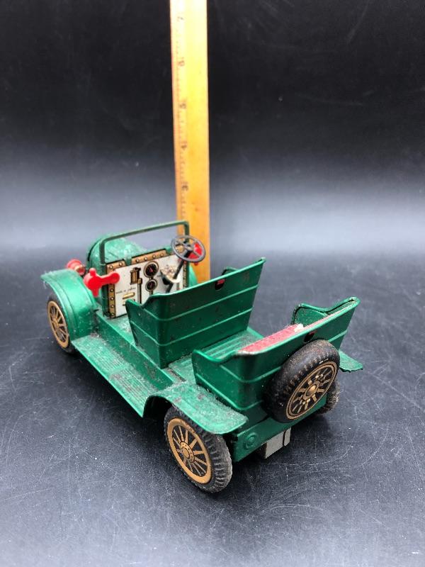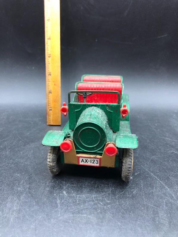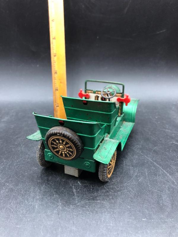 Vintage tin toy jeep. Pull back action. Green metal with red plastic. Made in Japan. Signs of age.