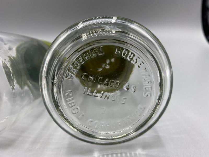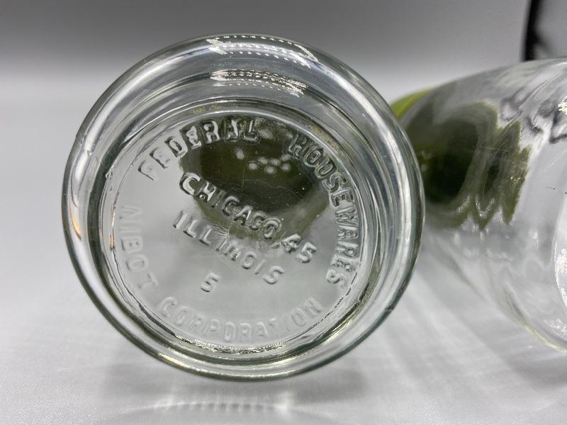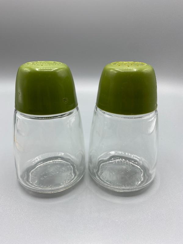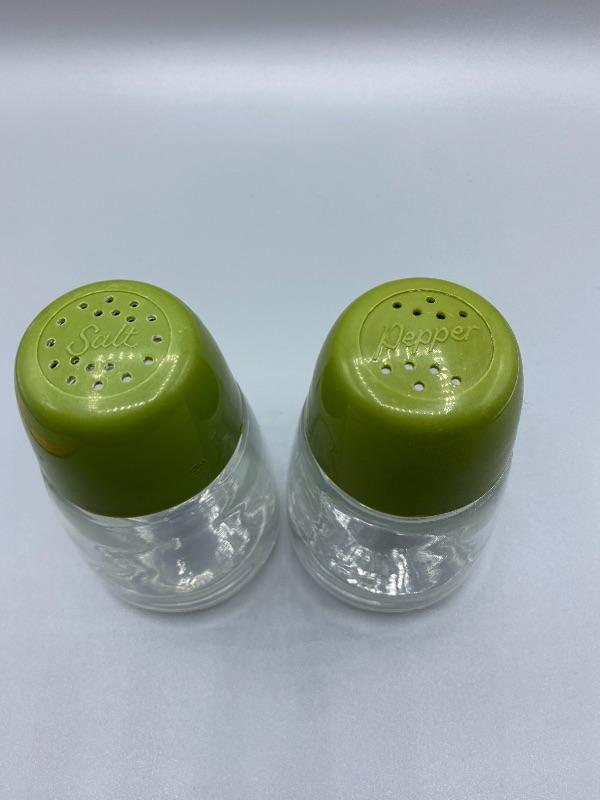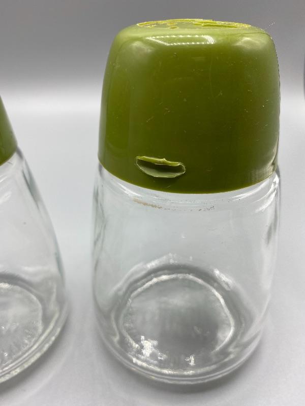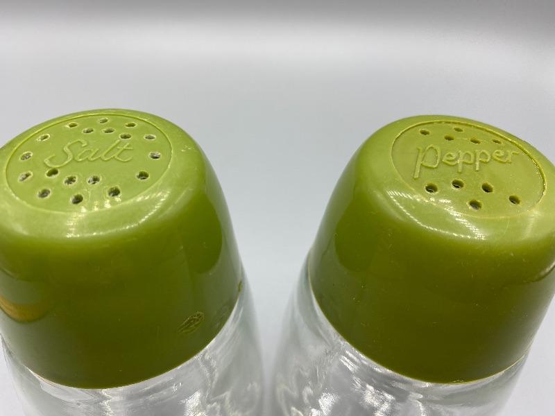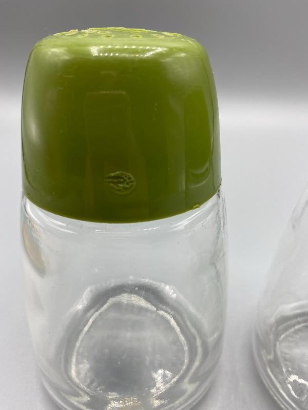 Vintage Federal Housewares salt and pepper shakers. Clear glass base with green plastic top. Labeled salt and pepper across the top. Good used condition. There is a spot on each lid where something hot must have touched it and melted an indent.