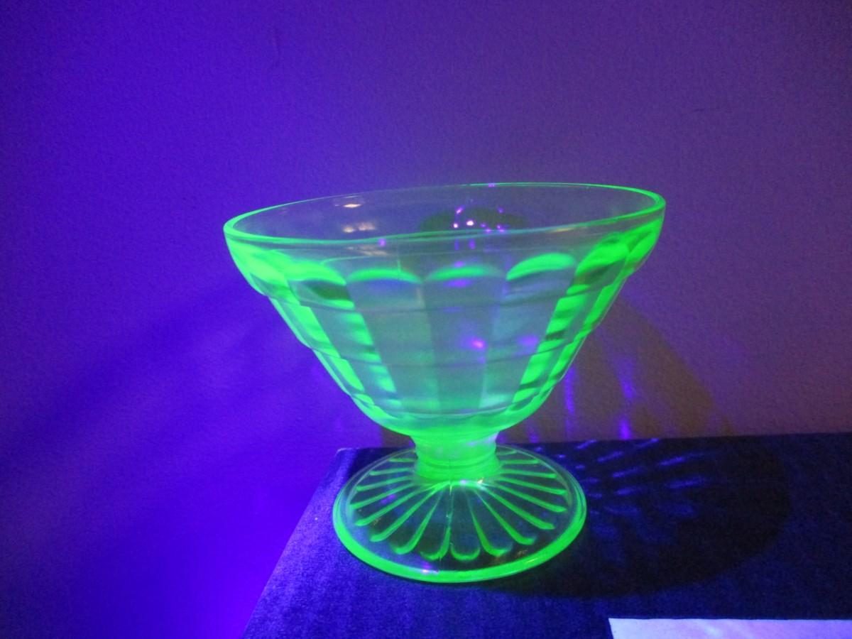 This vintage green uranium glass sherbet dessert cup features a unique ribbed block design, making it a decorative and functional piece for any home. The vibrant green color and retro design give it a charming and nostalgic appeal, perfect for adding a touch of vintage flair to any space. Made with uranium glass, this cup also emits a soft glow under black light, adding an extra element of interest to its aesthetic.