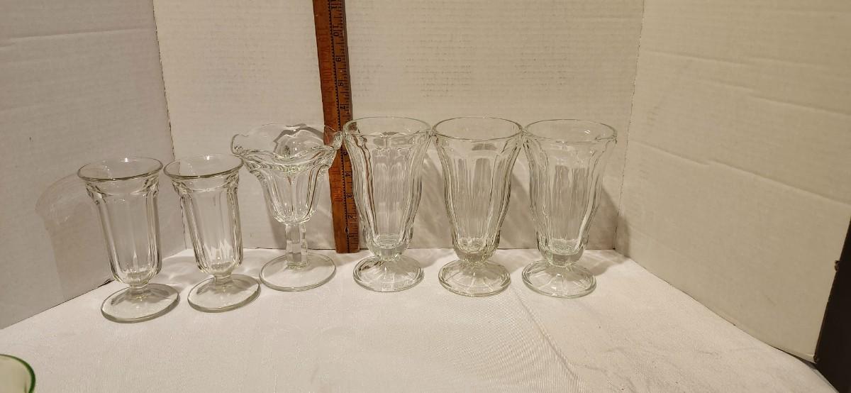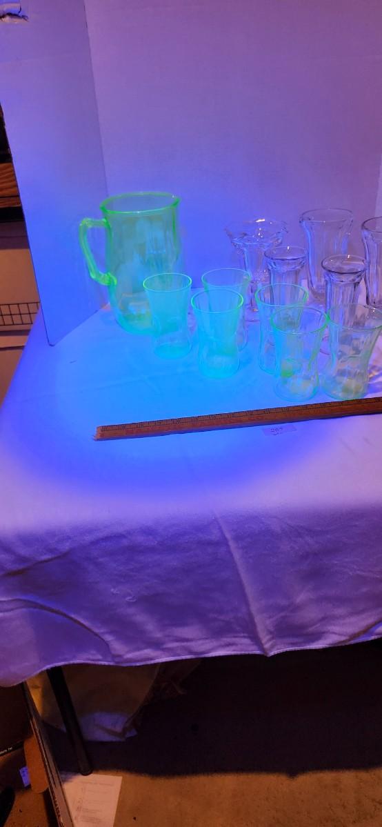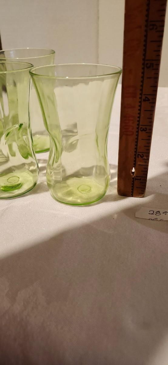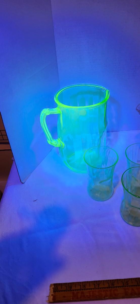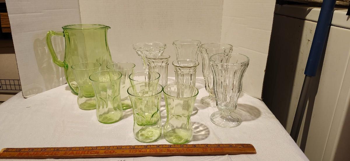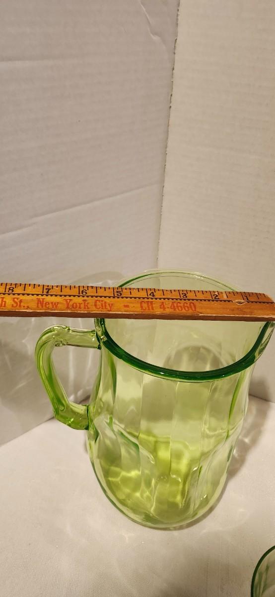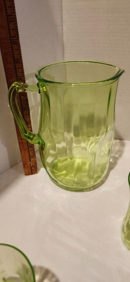 Vintage Green Uranium Vaseline Glass Pitcher and 6 Glasses, Ice Cream Sundae Glasses