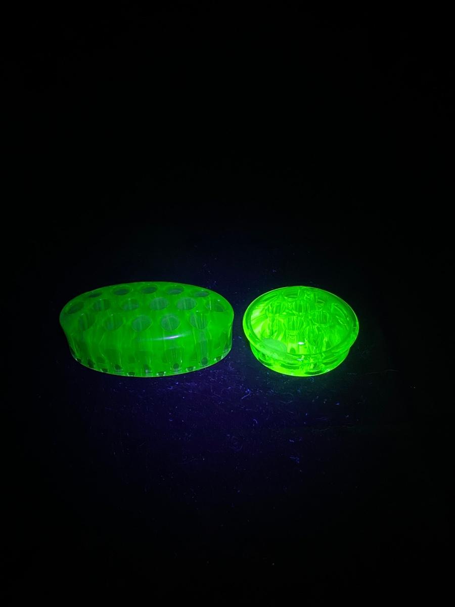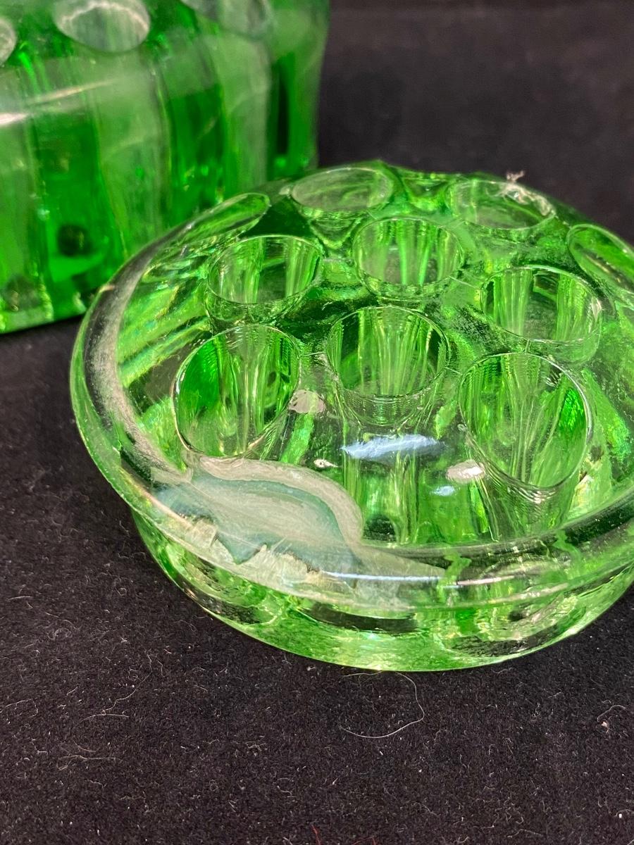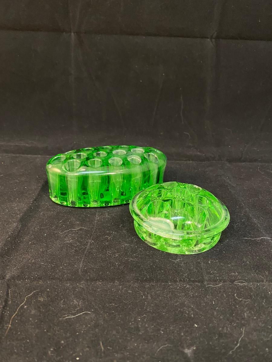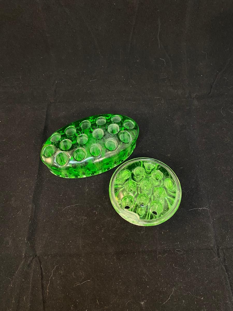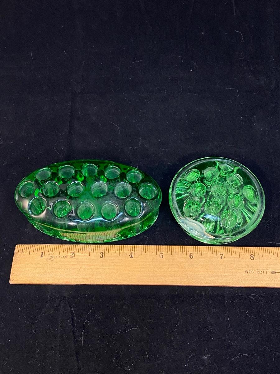 Vintage Green Vaseline Uranium Glass Floral Arrangement Frogs. Both glow bright under blacklight. The circle shaped one does have a damaged spot/crack but is not broken or sharp. 3" & 5" size.