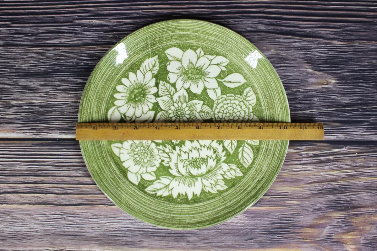 13 1/2" vintage green and white dinnerware plate adorned with flowers, there is minimal ware and no significant chips or scratches.