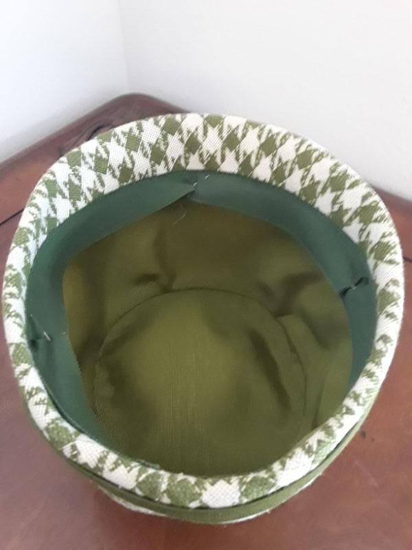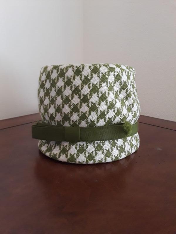 Vintage Woman's Hat. Green & White Houndstooth pattern. Very 1960s. Has a small brim and green ribbon bow. This hat is tall. Great Condition. Very clean.