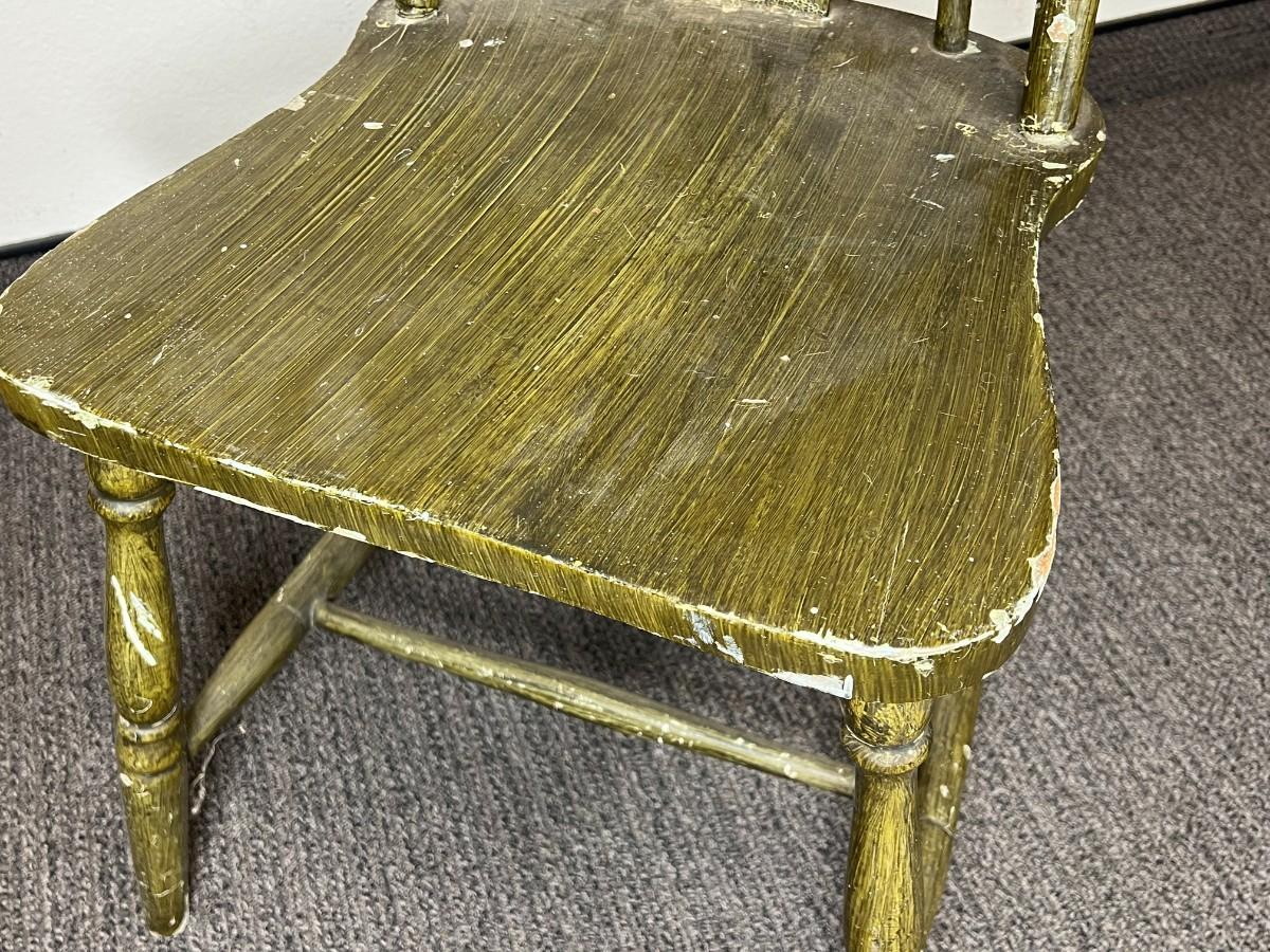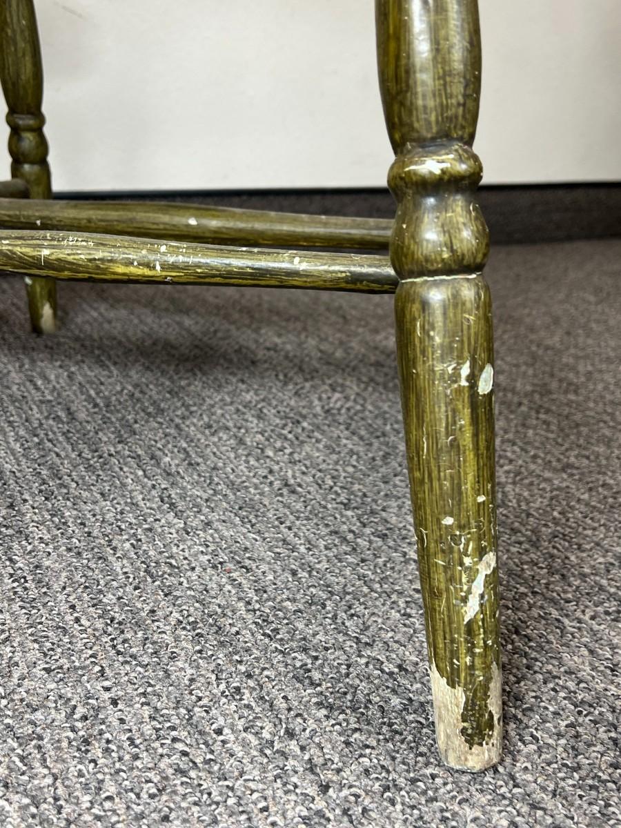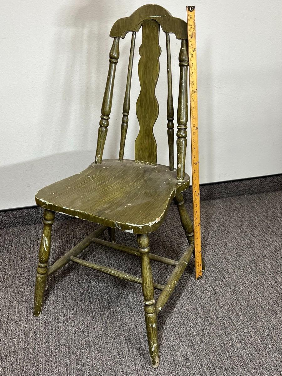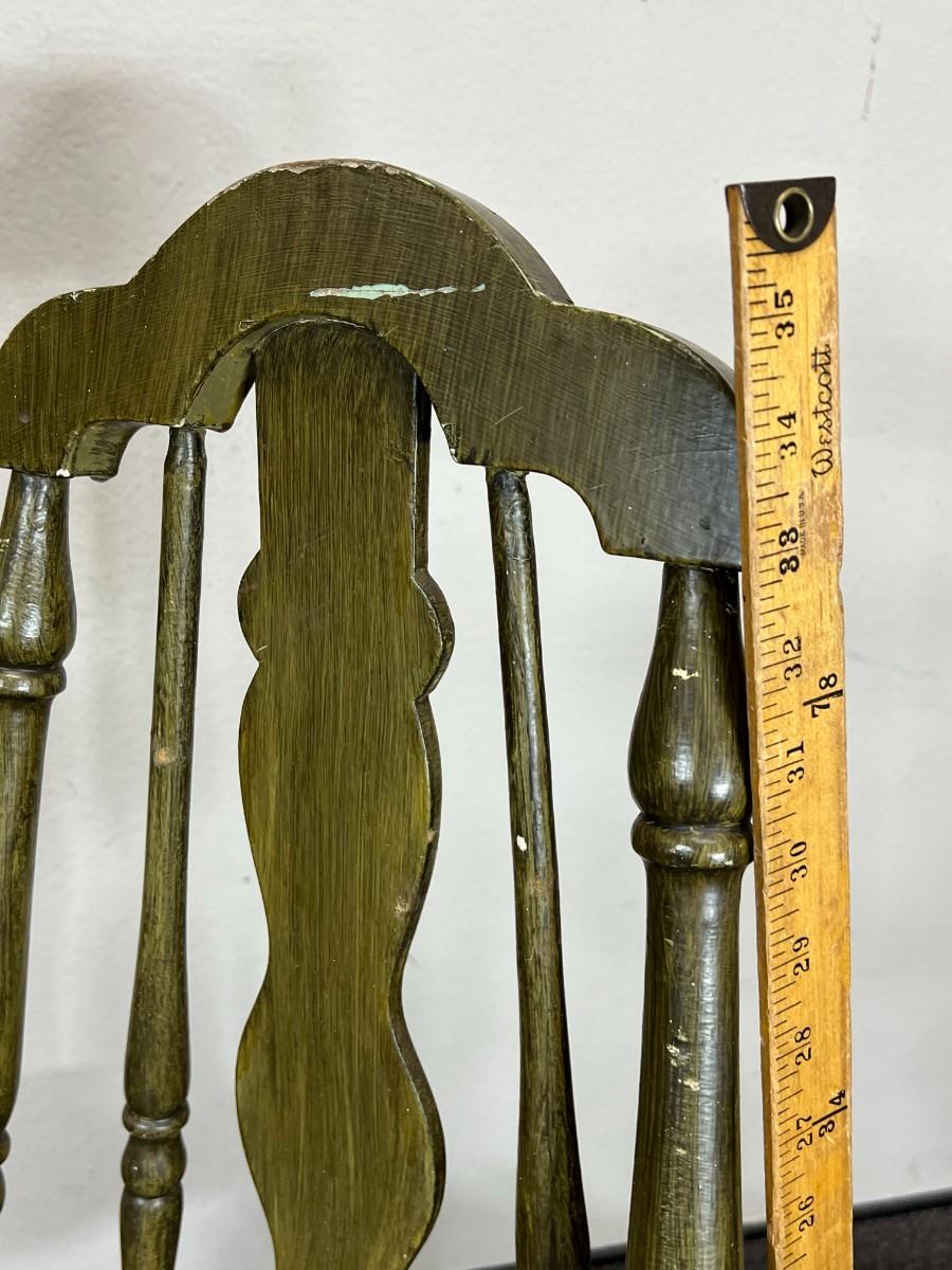 Vintage Green Wood Shabby Chic Accent Dining Room Chair, there is vintage wear to the wood, but there is no significant damage to the chair and is in good displayable condition. Check pictures for more details and for sizing.