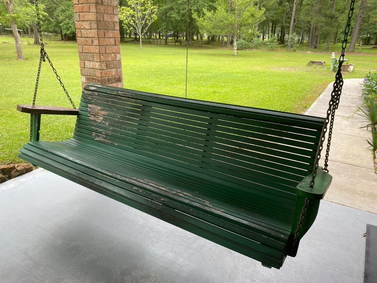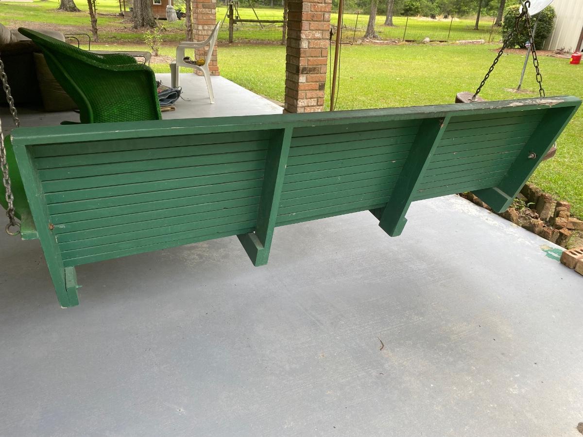 Vintage green wooden porch swing. Some paint loss, otherwise, in very good condition. Approx 79-1/2W x 18 seat depth x 23H