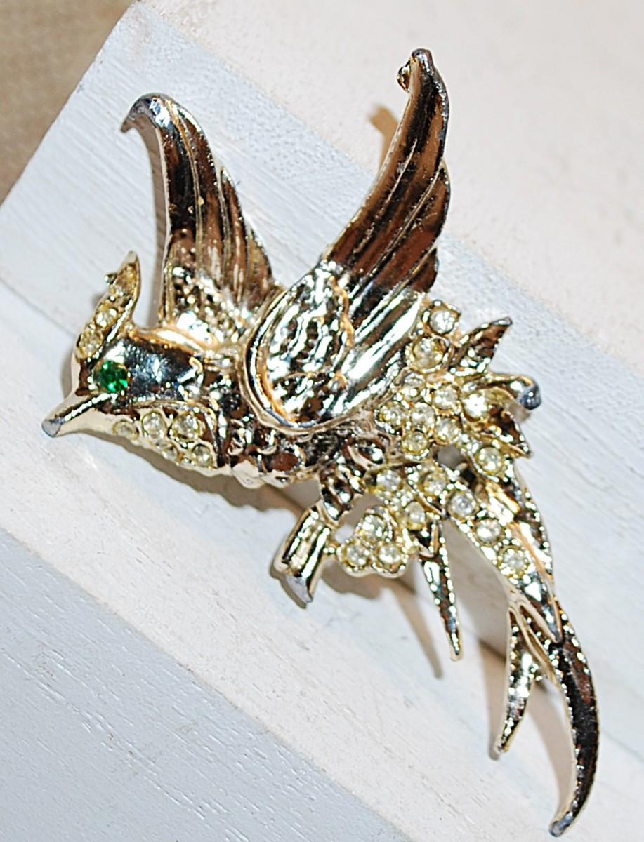 VINTAGE Green-Eyed Bird BROOCH (2½" x 1½") with 27 Diamond Style Stones on a Silver Tone Setting