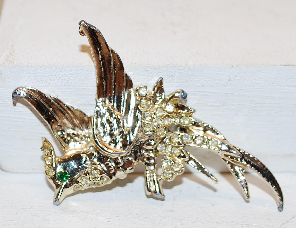 VINTAGE Green-Eyed Bird BROOCH (2½" x 1½") with 27 Diamond Style Stones on a Silver Tone Setting