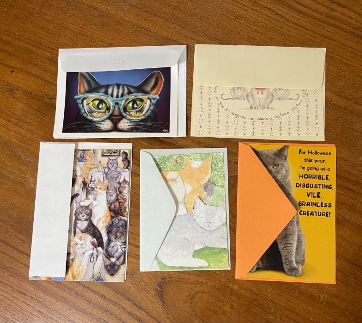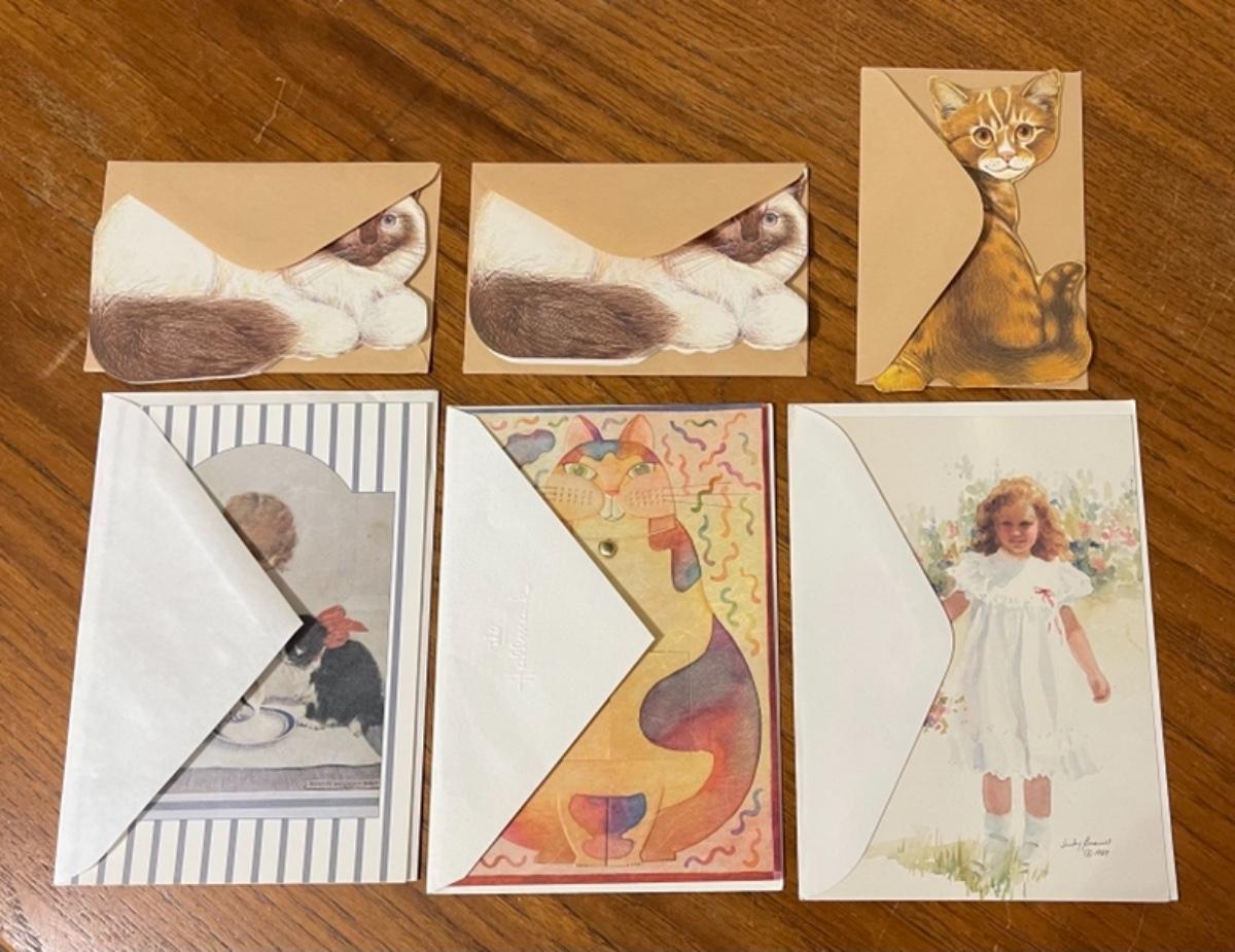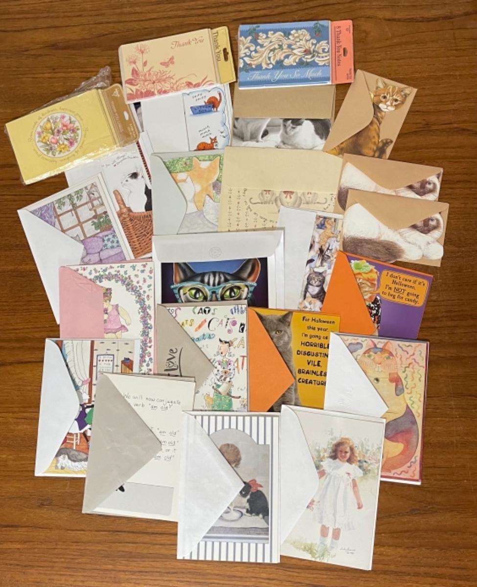 Lot of 21 cards with envelopes - all nice quality and mostly cat themed. Also, 3 packages of Thank you cards by Hallmark (2 unopened, 1 mostly full). Shipping available.