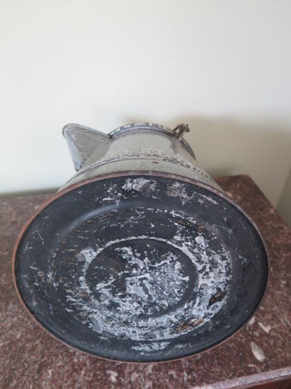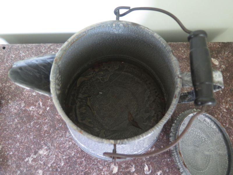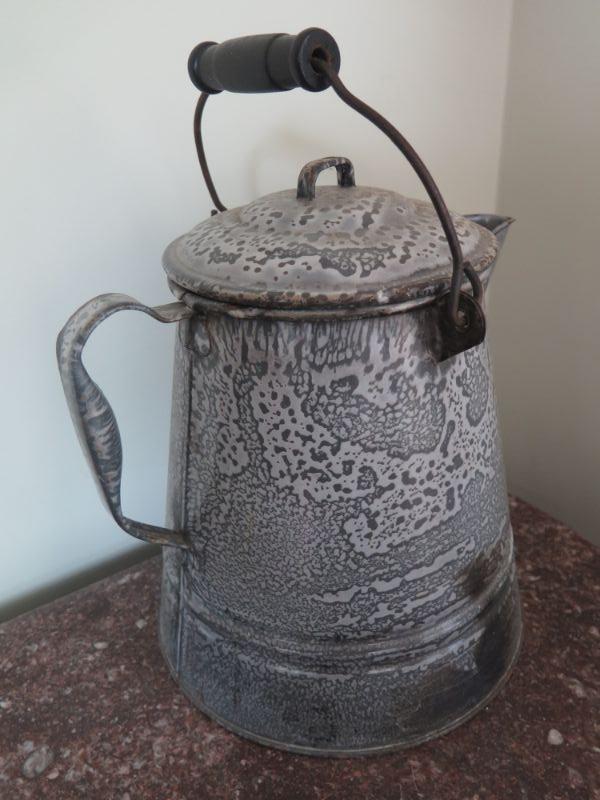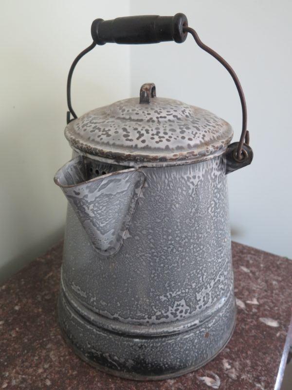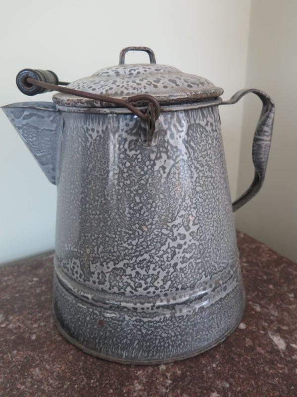 Vintage grey enamel coffee pot. **Please read Terms and Conditions before placing a bid. Pick up is Sunday, September 1, 2019 from 10am to 4pm in Williamstown. All sales are final. All sales are as is, where is. Please review all photos. Any props included in photos are not included in listing. All measurements are approximate.