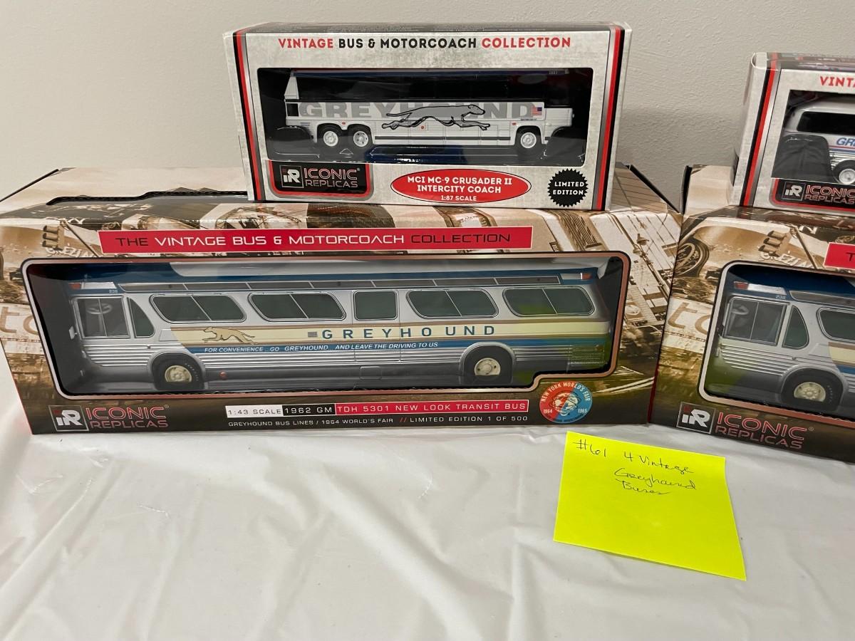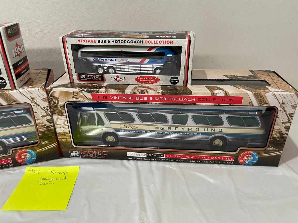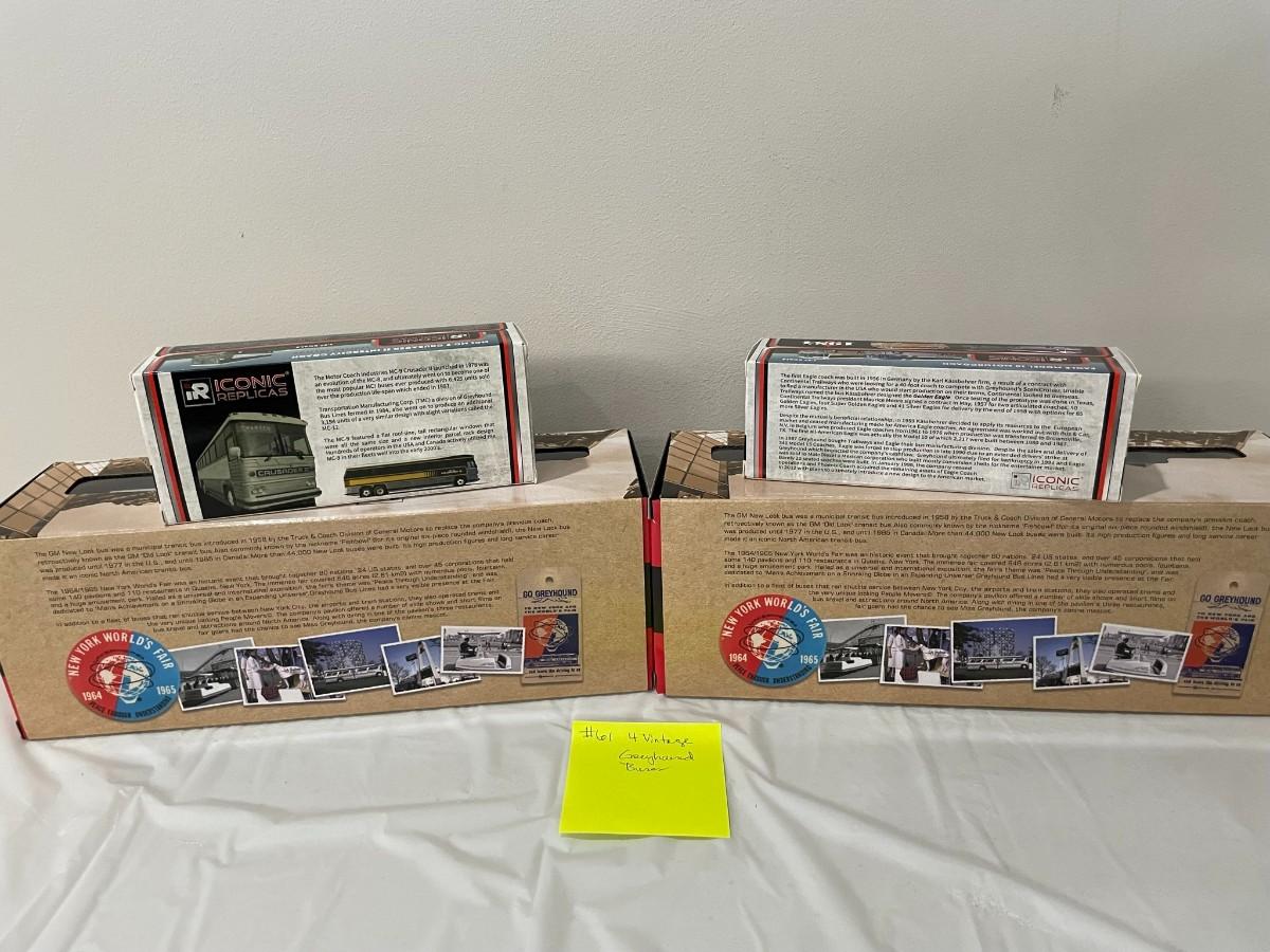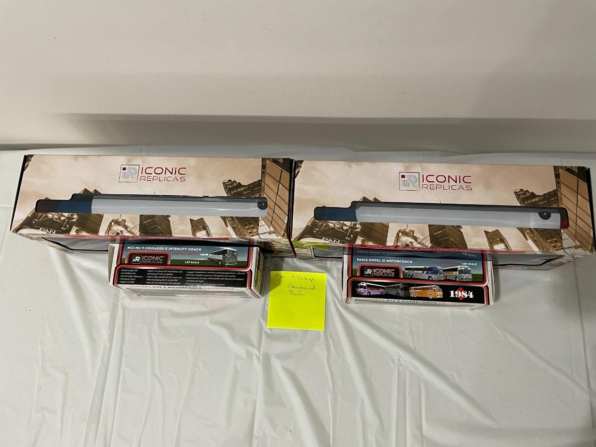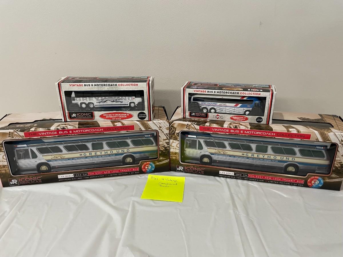 4 Vintage Greyhound Diecast Buses - New - 1:87 & 1:43 Scale