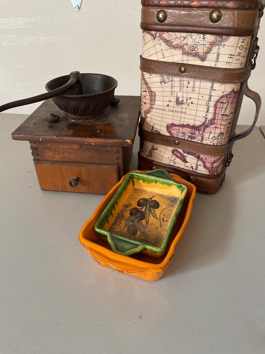 Vintage grinder, Italy pan and decor luggage