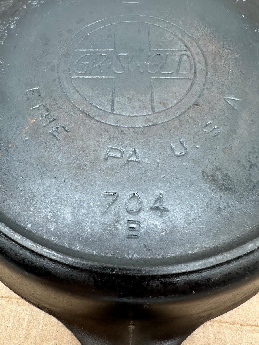 Authentic vintage Griswold cast iron skillet, size #8, featuring the desirable large block logo with cross and marked “ERIE PA, U.S.A.” on the underside. Model 704 B. Solid, well-made pan with good thickness and classic Griswold quality. Excellent piece for collectors or everyday cooking.