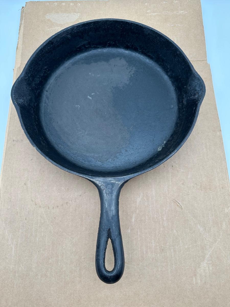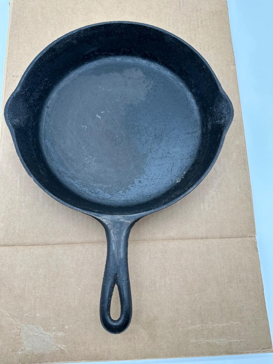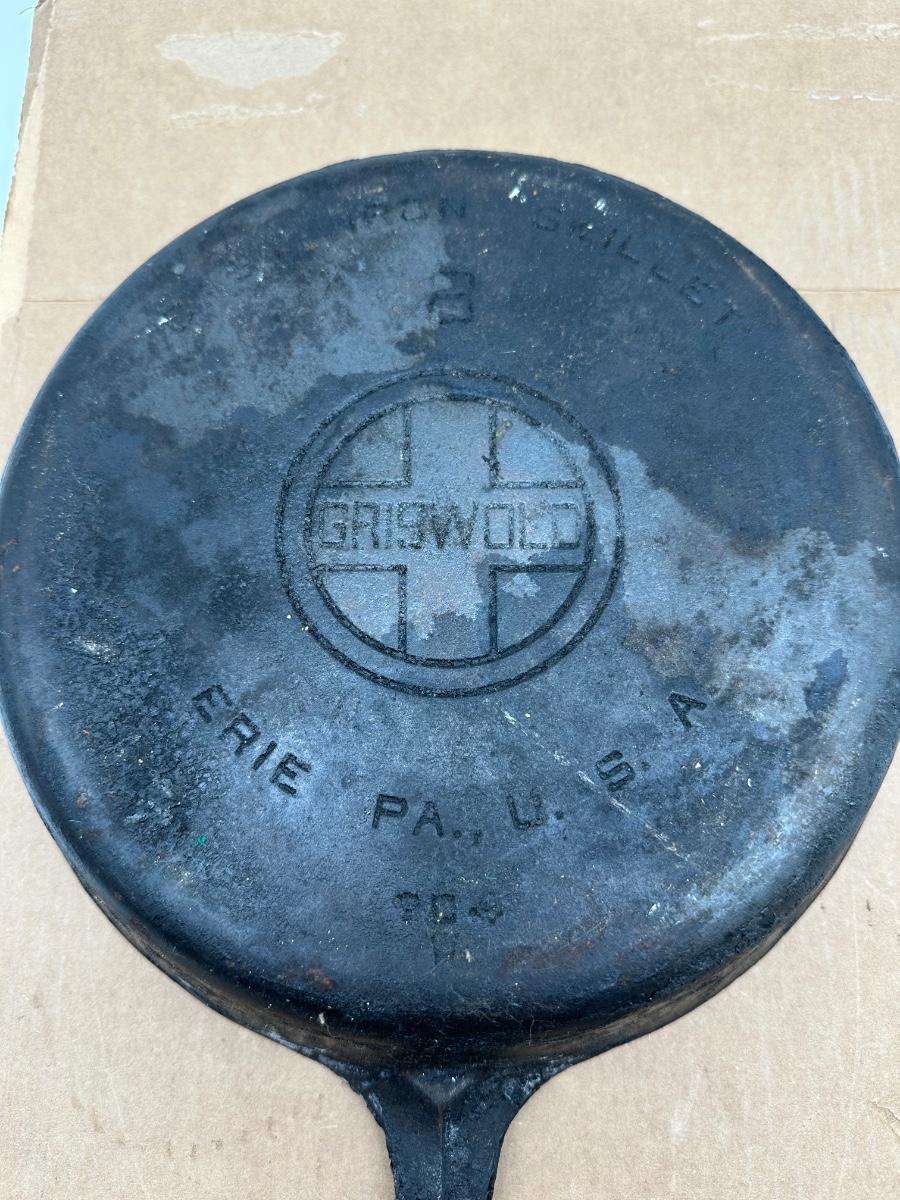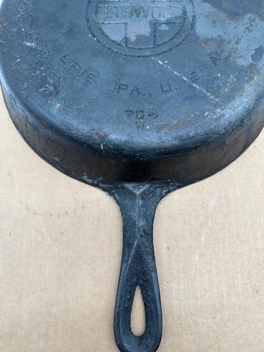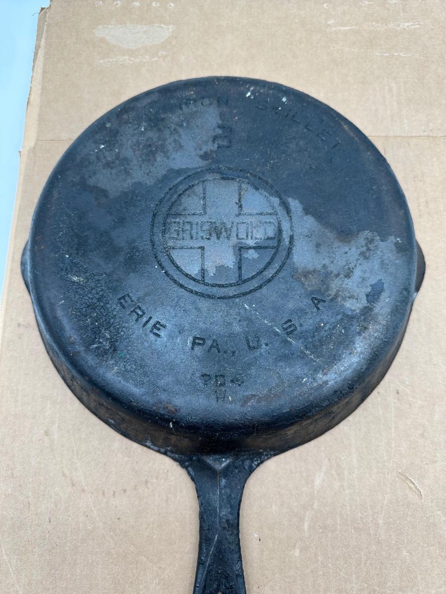 Authentic vintage Griswold cast iron skillet, No. 8, featuring the desirable Large Block Logo with cross and “ERIE PA., U.S.A.” marking on the bottom.