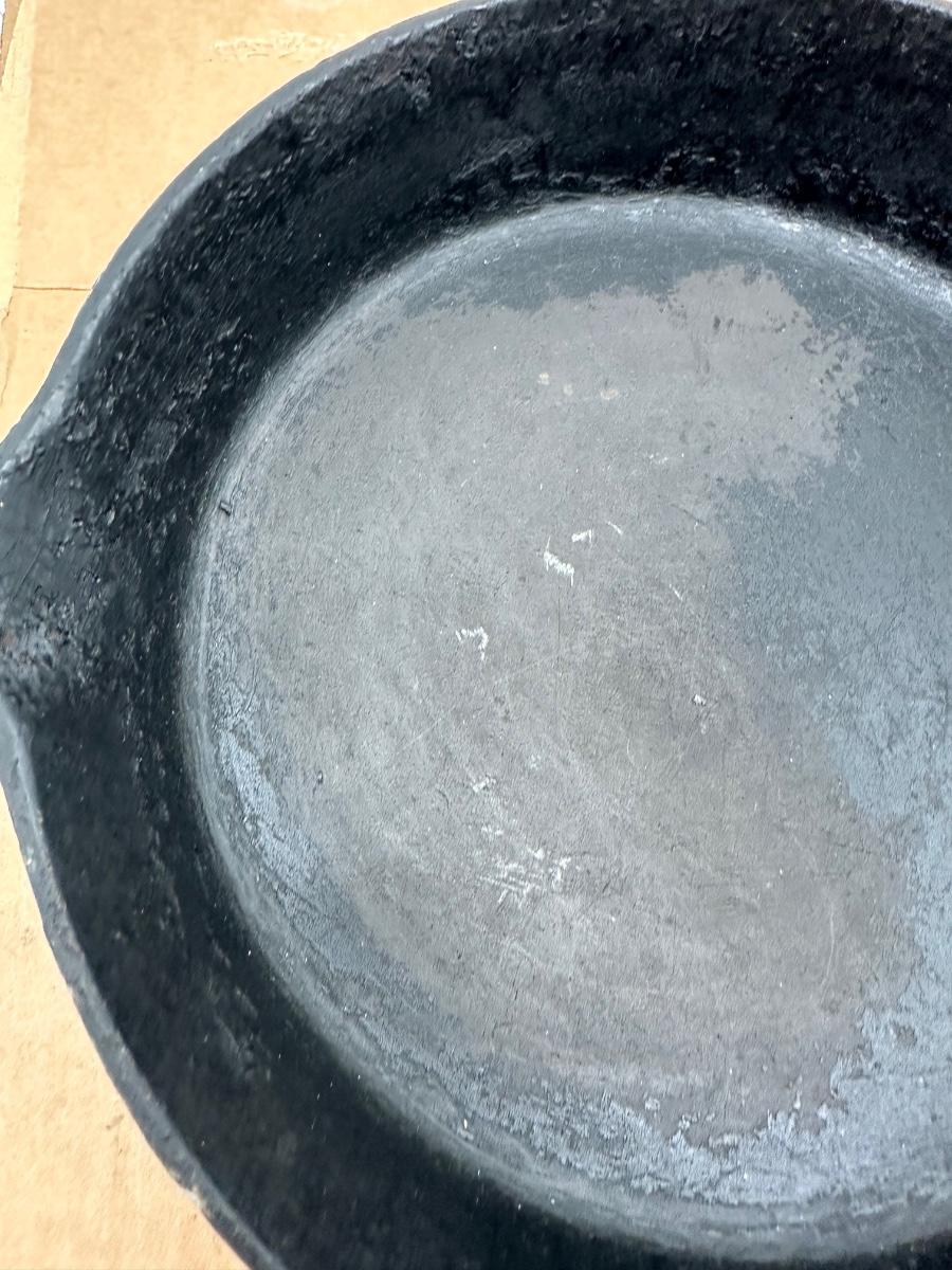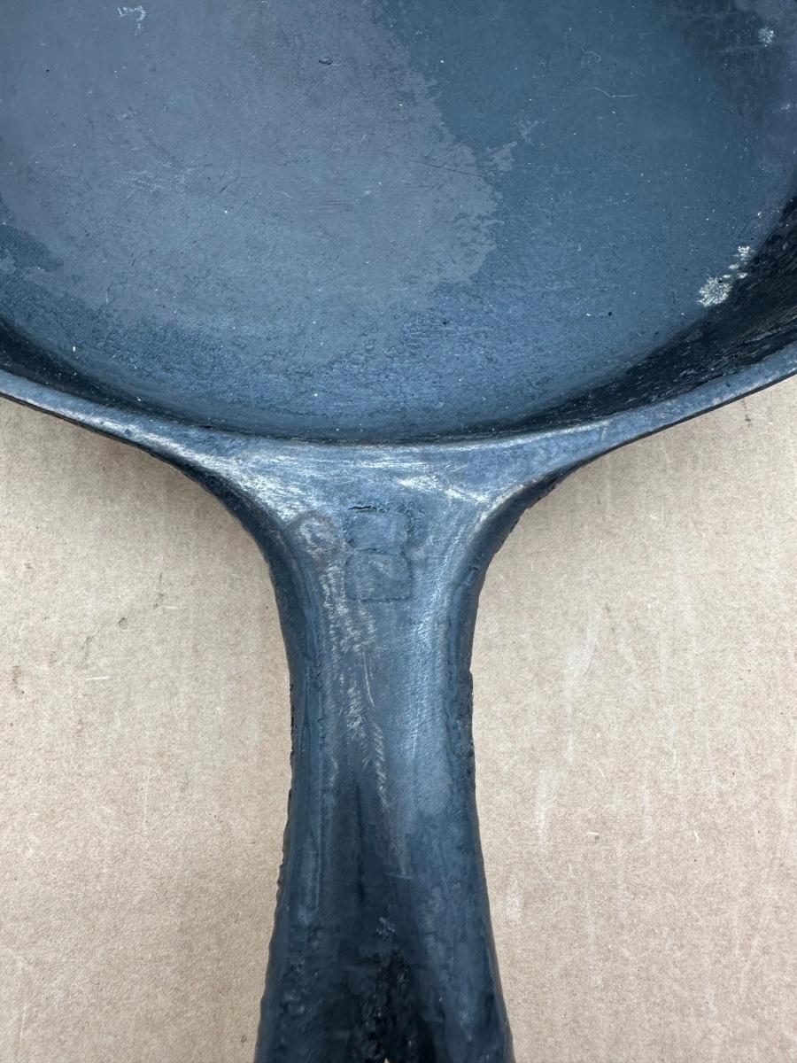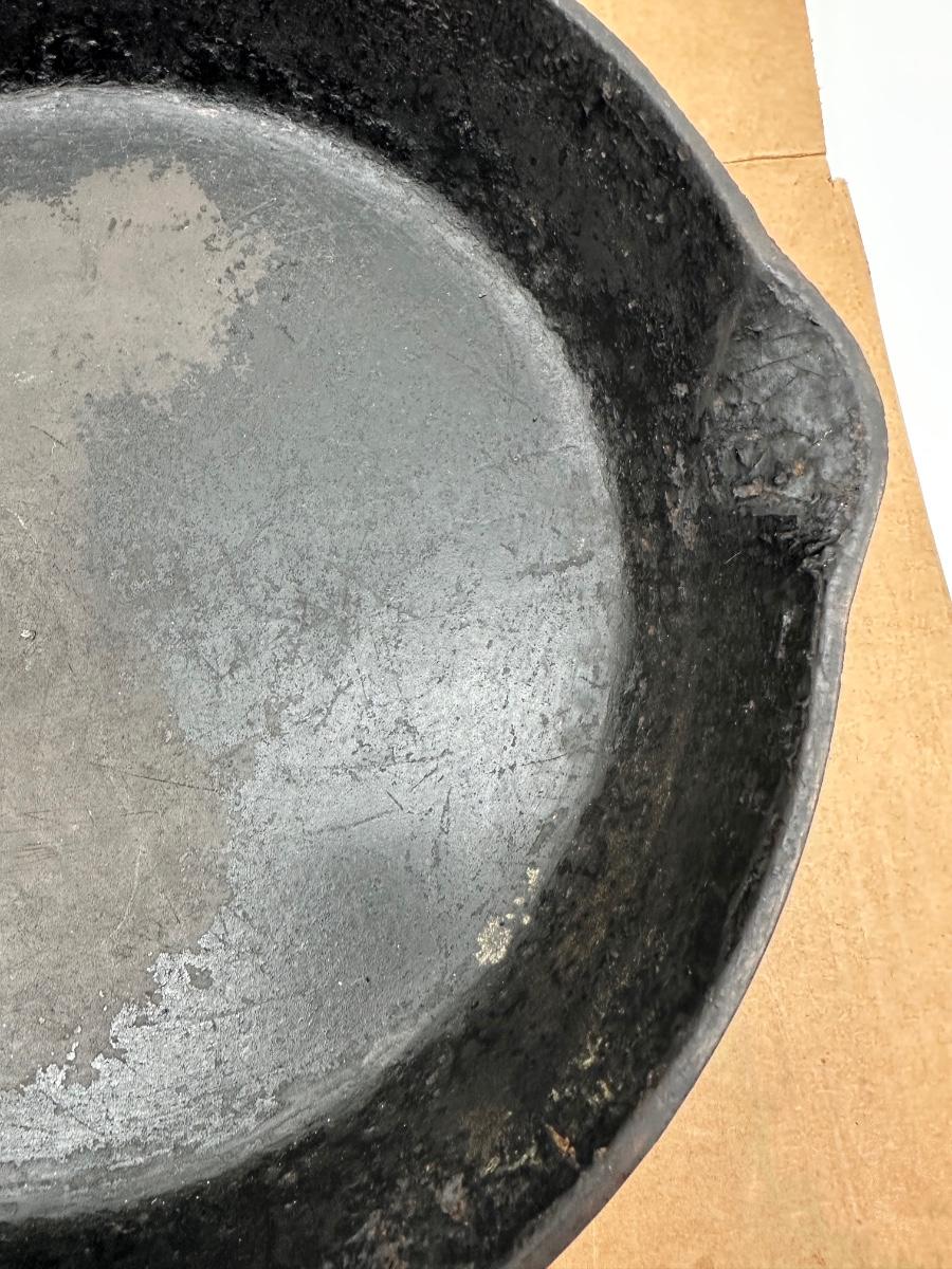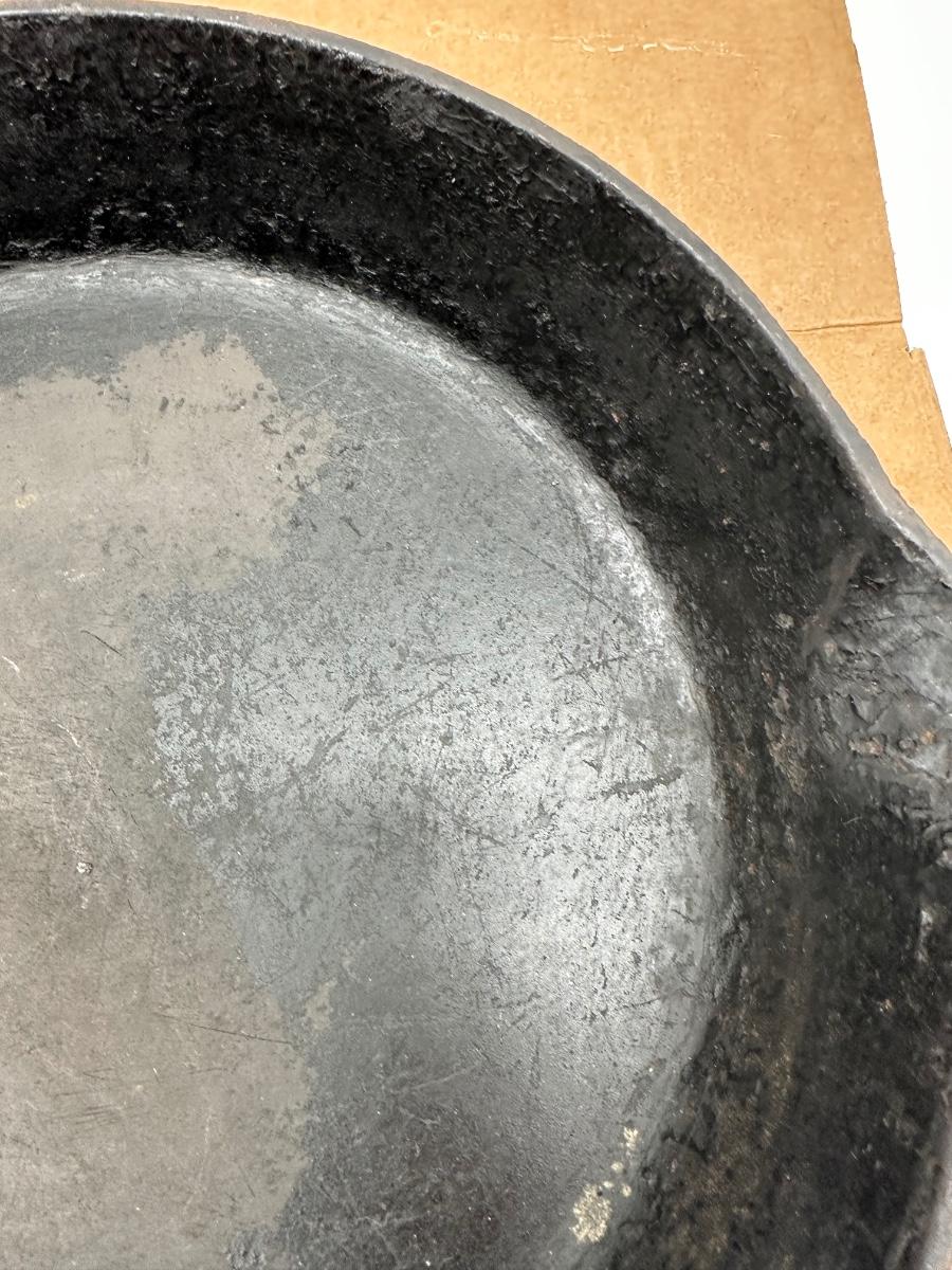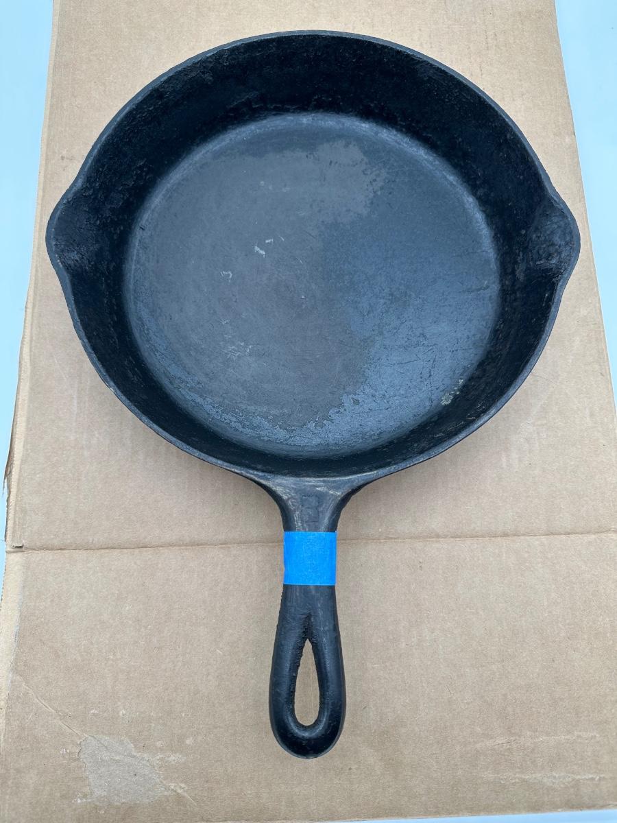 Authentic vintage Griswold cast iron skillet, No. 8, featuring the desirable Large Block Logo with cross and “ERIE PA., U.S.A.” marking on the bottom.