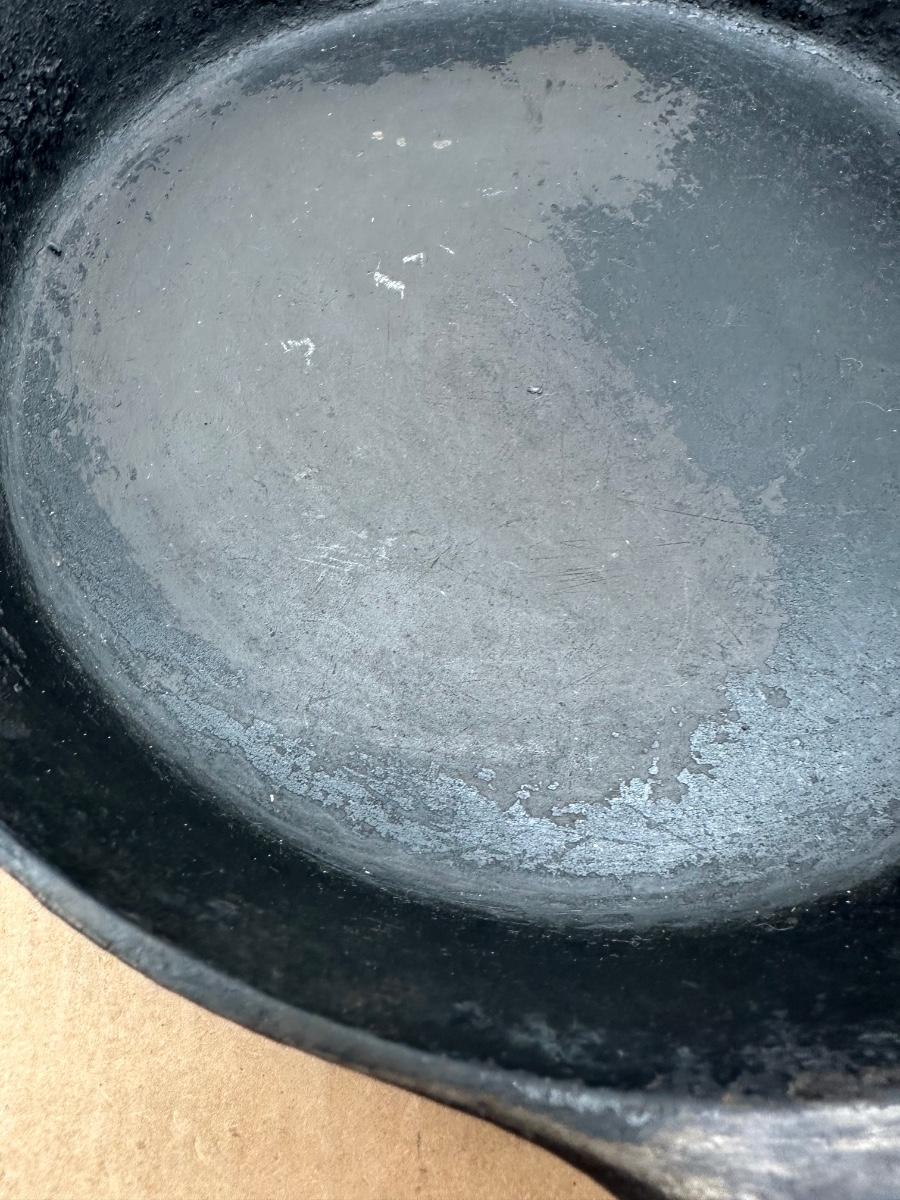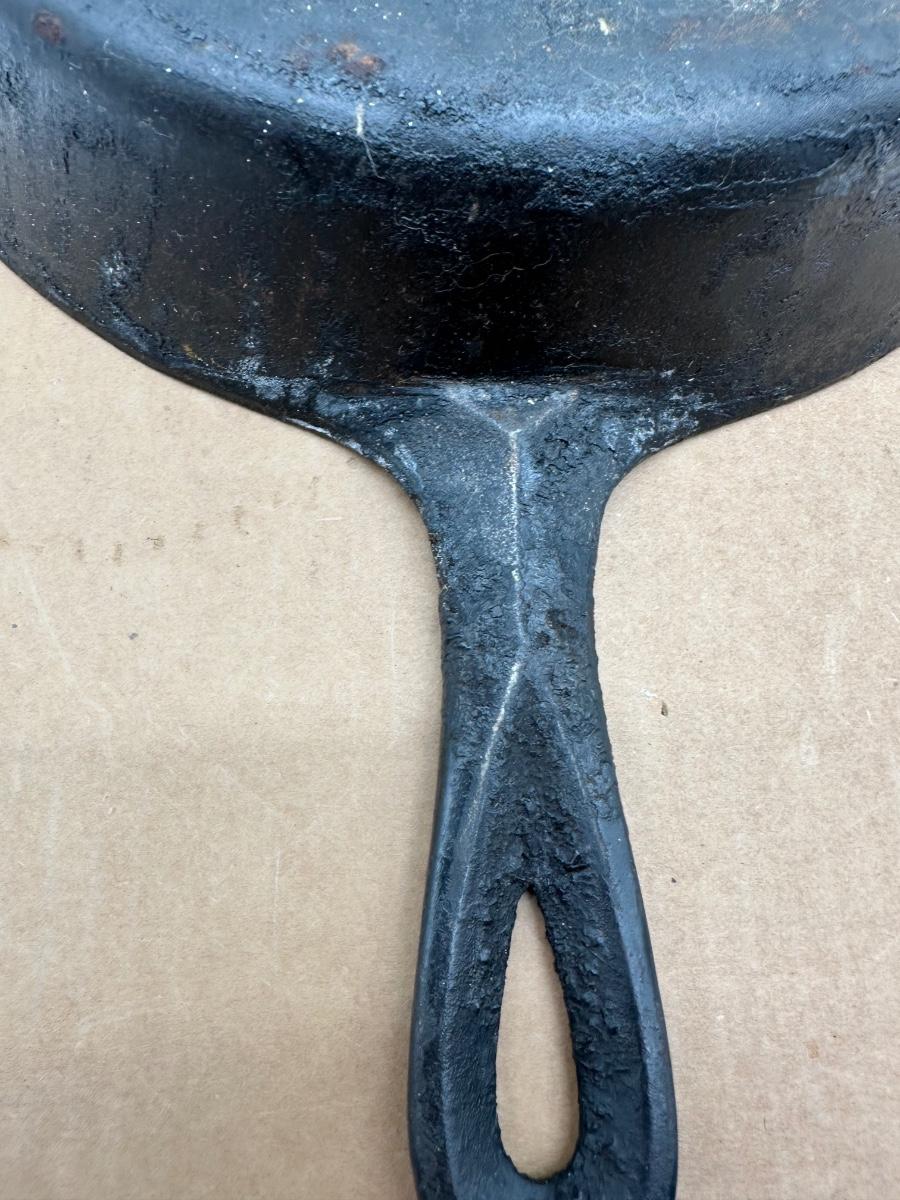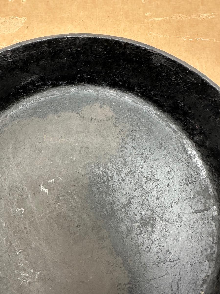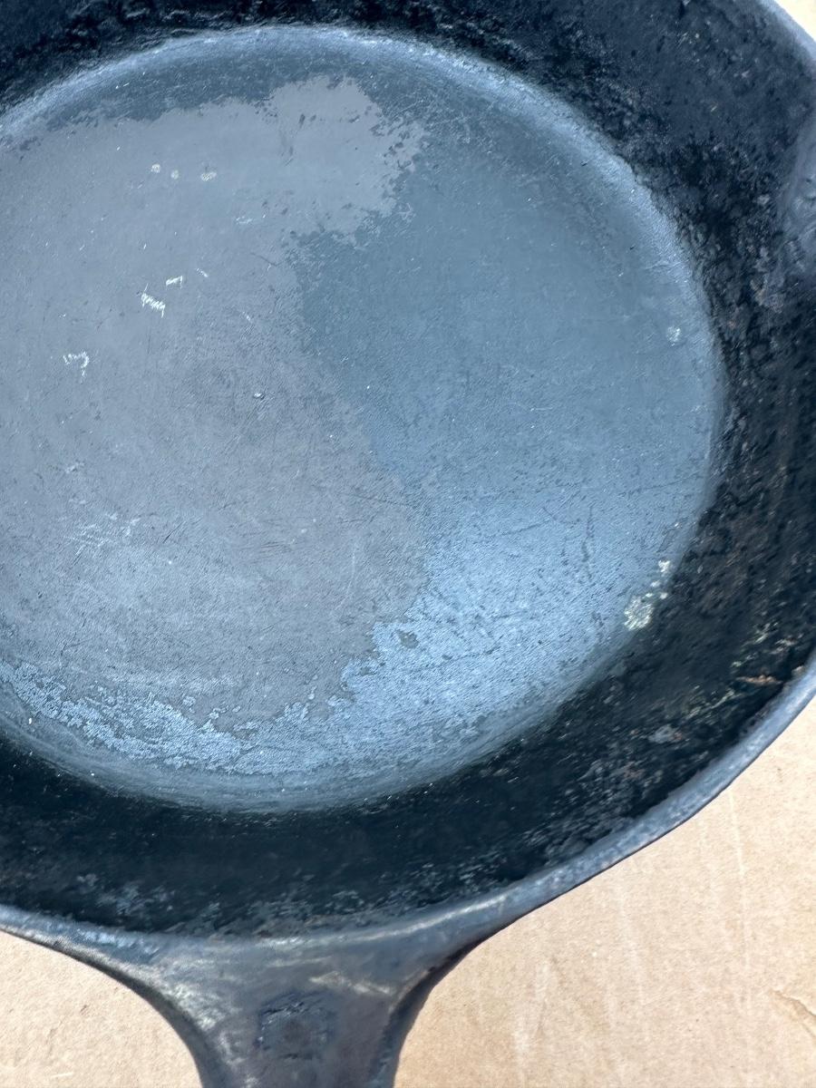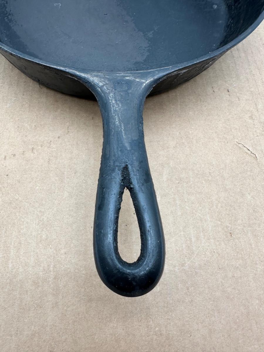 Authentic vintage Griswold cast iron skillet, No. 8, featuring the desirable Large Block Logo with cross and “ERIE PA., U.S.A.” marking on the bottom.