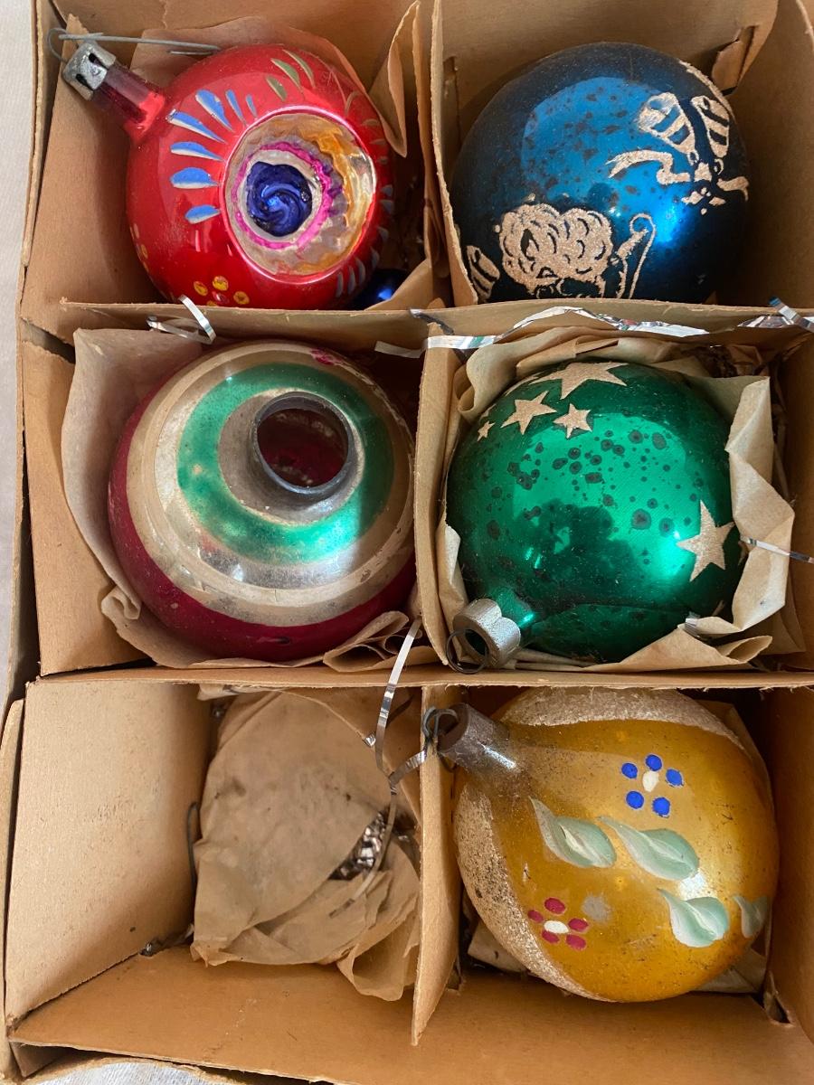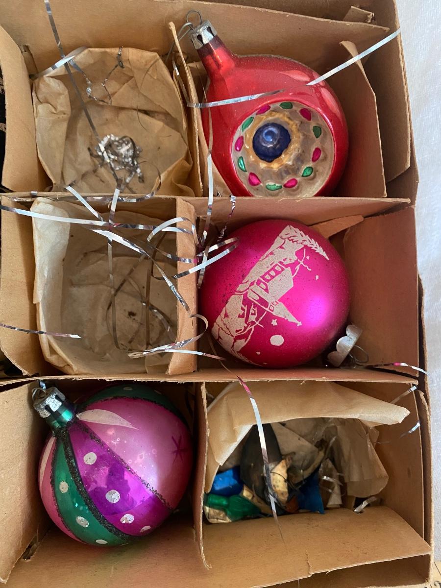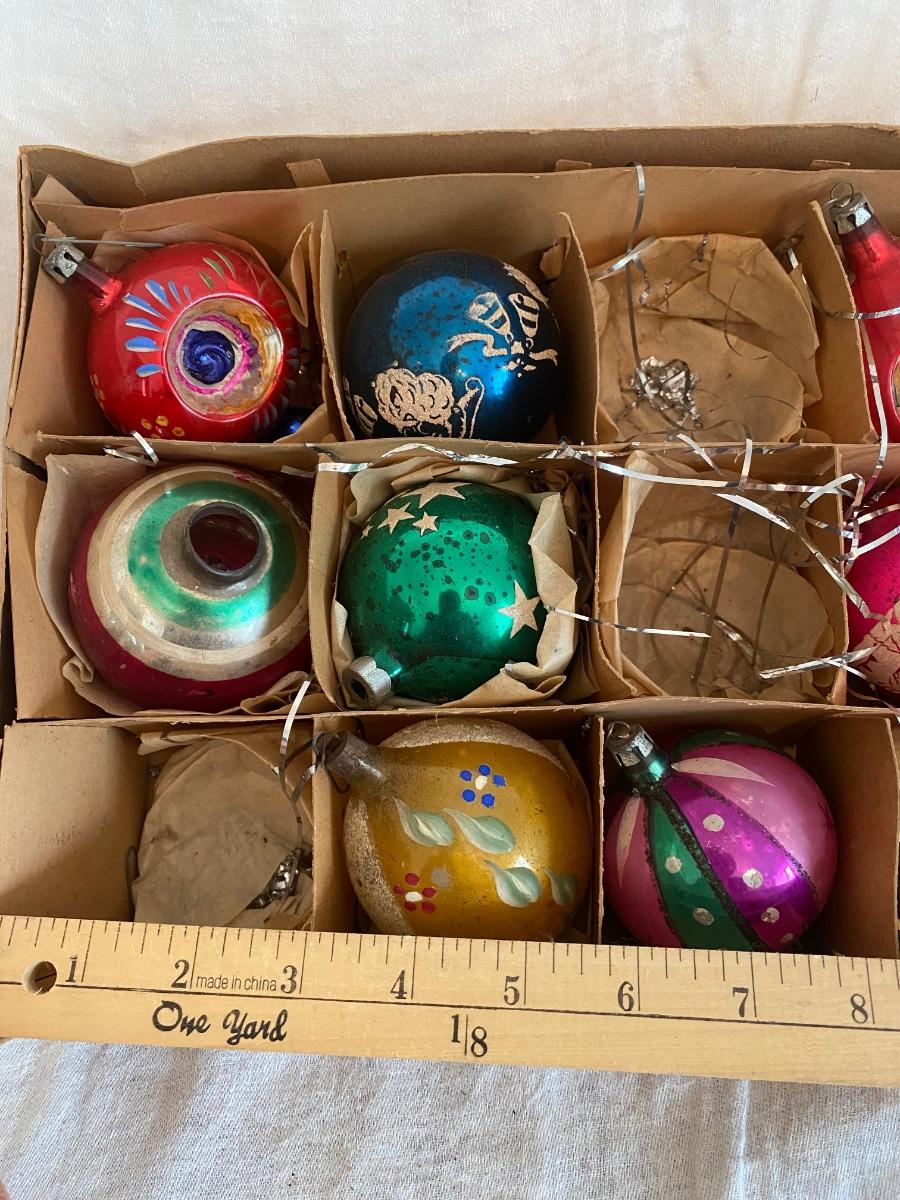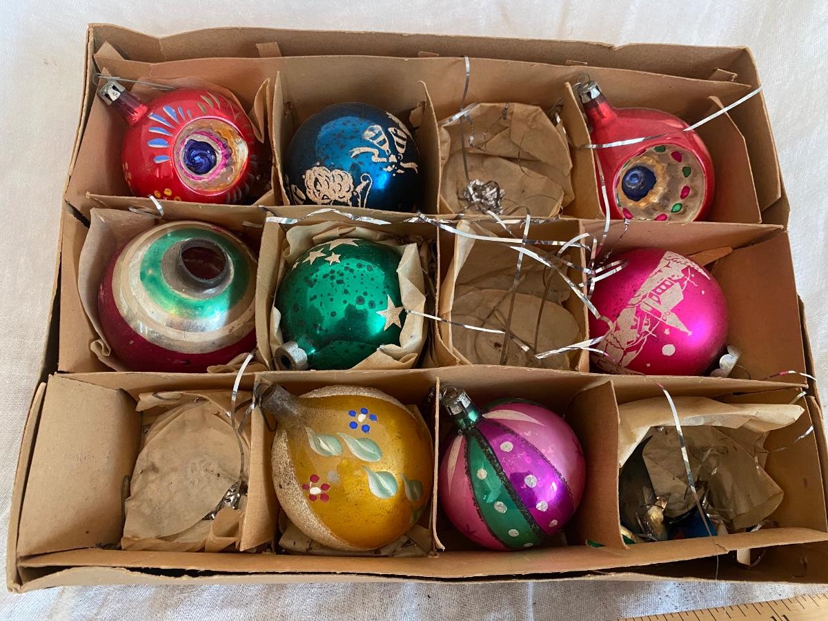 Vintage group of 8 Christmas ornaments, one is missing the top. No box top.