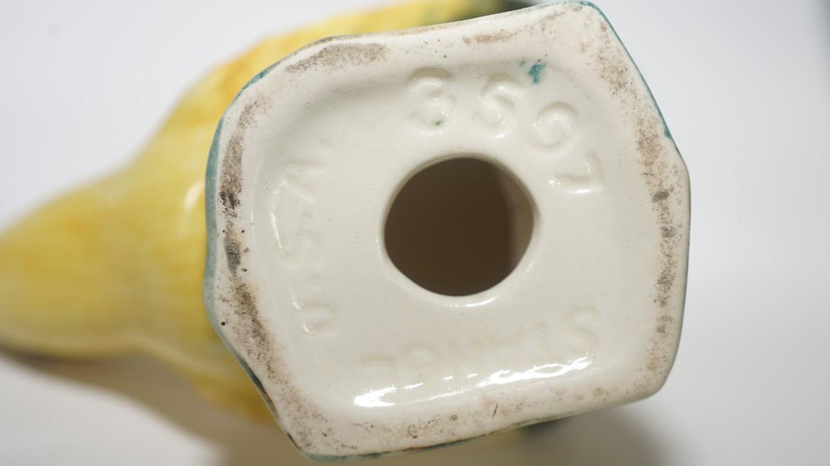 In good condition . the all yellow bird as a "tiny chip" at the end of the beak, ( maybe) feels a little rough