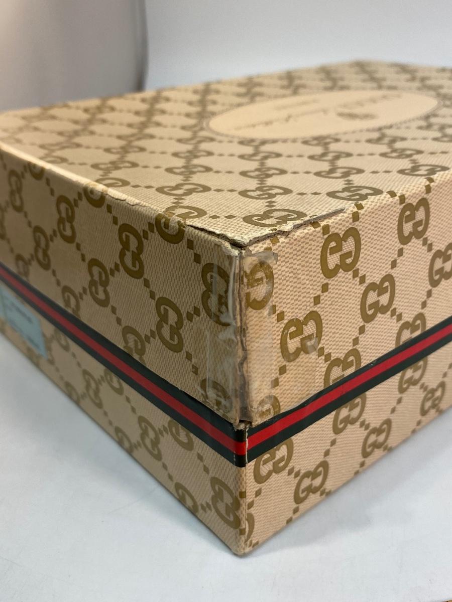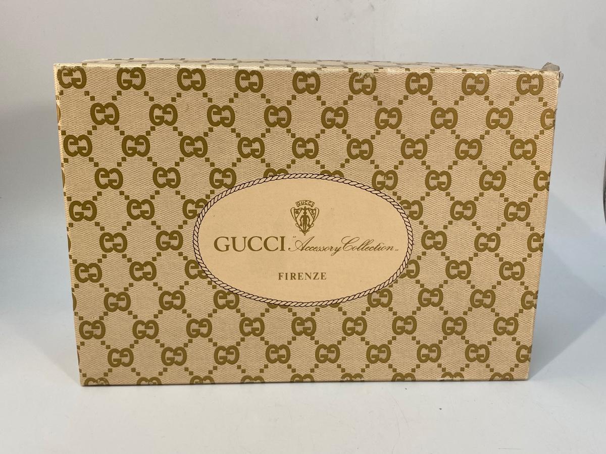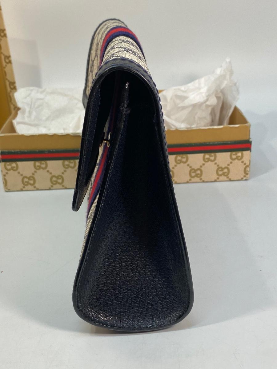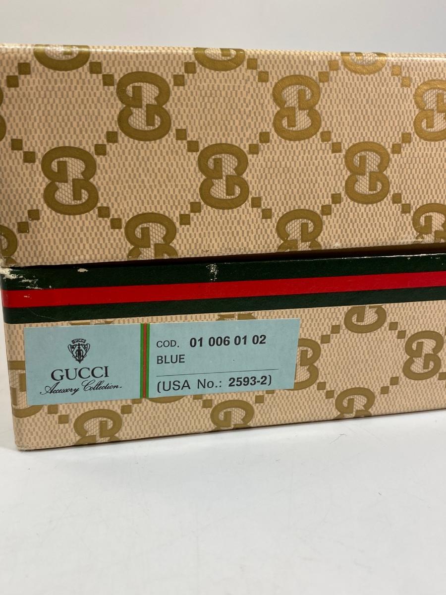 Vintage Gucci Accessory Collection Iconic Blue & Red Pattern Cosmetic Makeup Bag. In good used condition, light wear inside. Box has wear. From the 1980s.