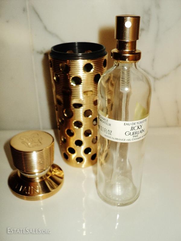 A rare Guerlain parfum vaporizer holding gold plated carved special bottle.