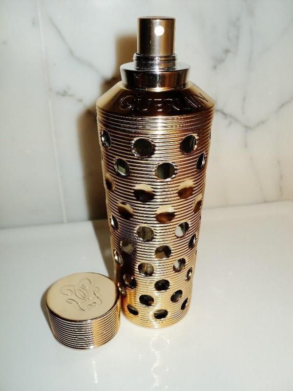 Grooves and embossed. The top opens to hold the bottle and has its original bottle with a bit of parfum. Could be refilled by Guerlain. In amazing Condition signed and copyright 1996 by Guerlain