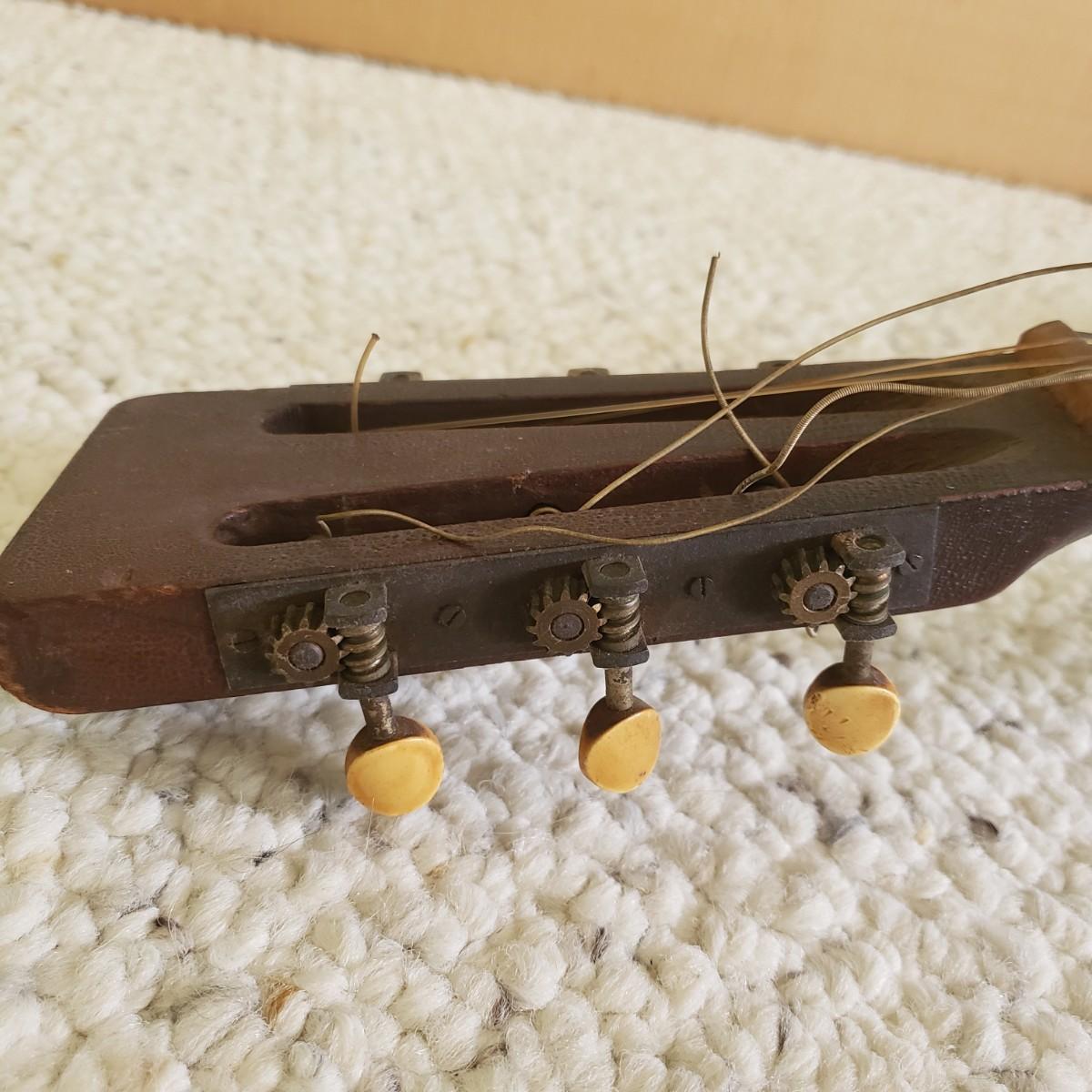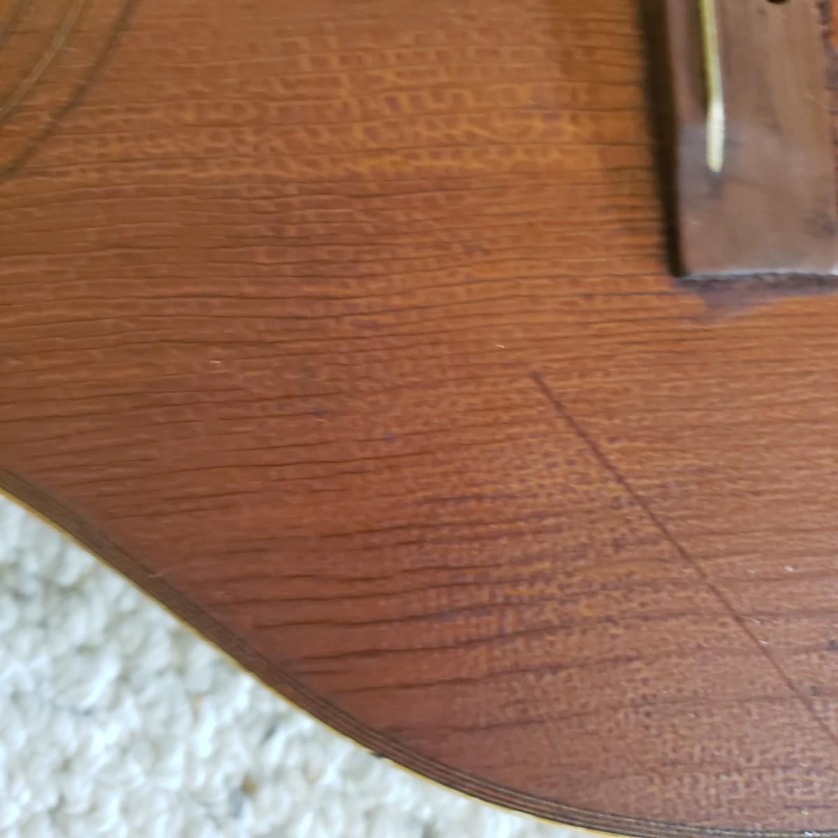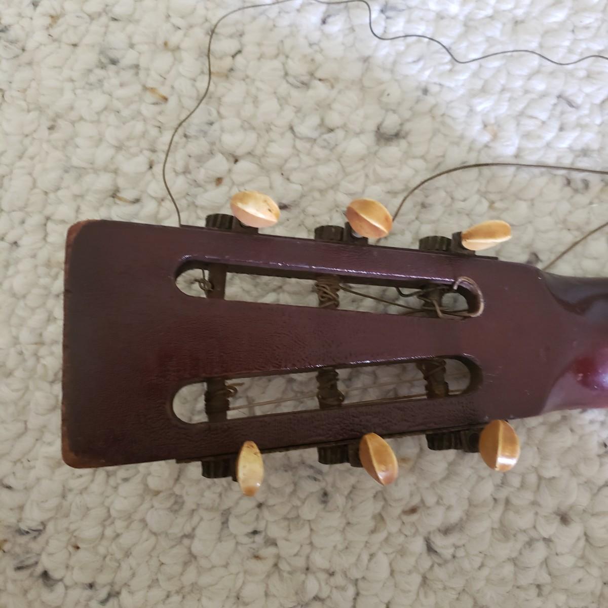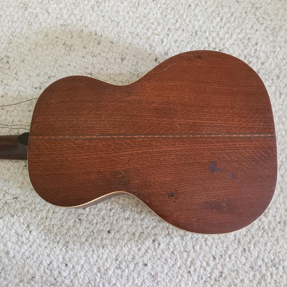 This lot features an acoustic guitar with unknown origin, as the label on the inside is torn off, yet there is a small piece left, see pictures. Due to its age it has some worn musical love on the finish. Comes in an unmarked cardboard box. The guitar measures 37" long. The body measures 18" x 14" x 3.5"H.