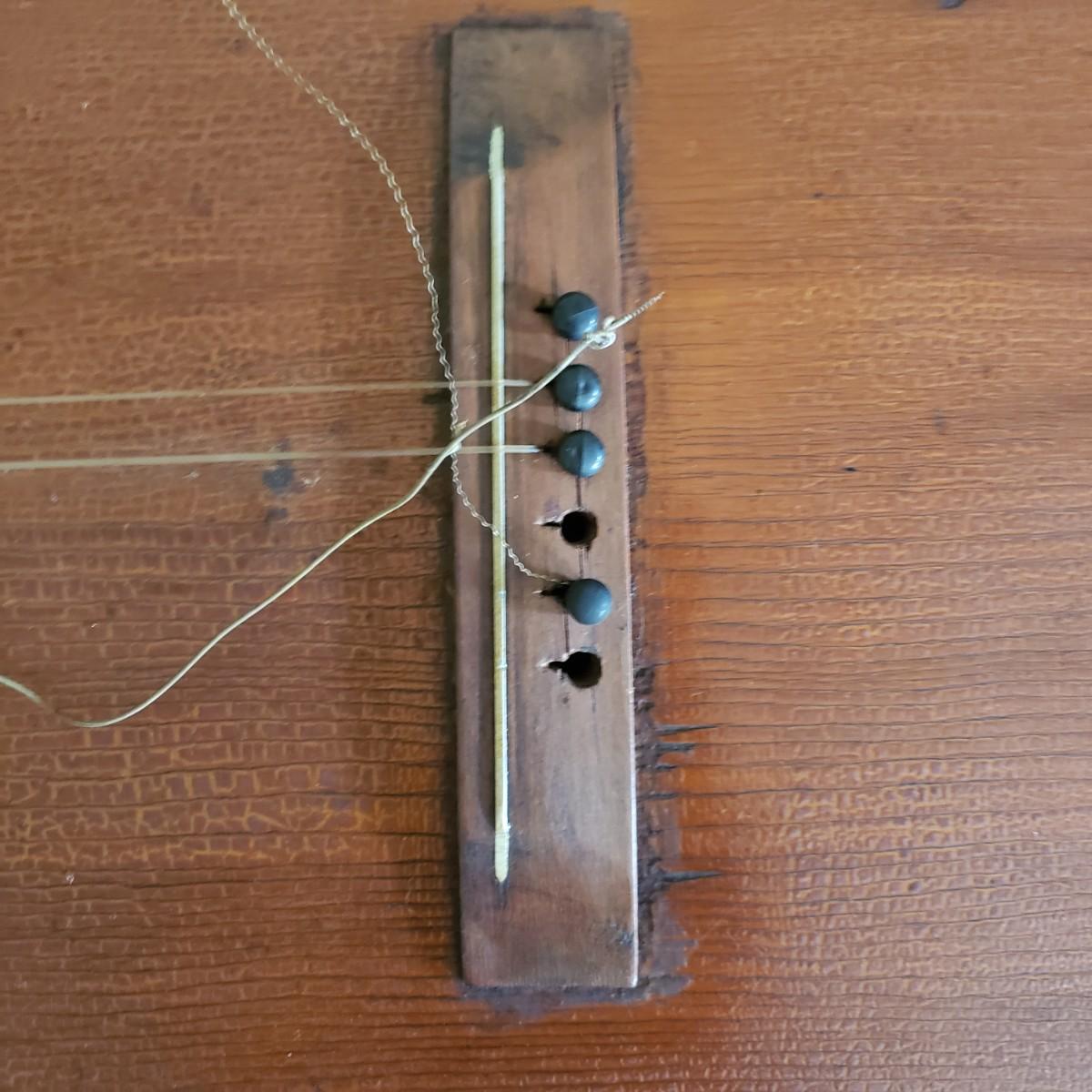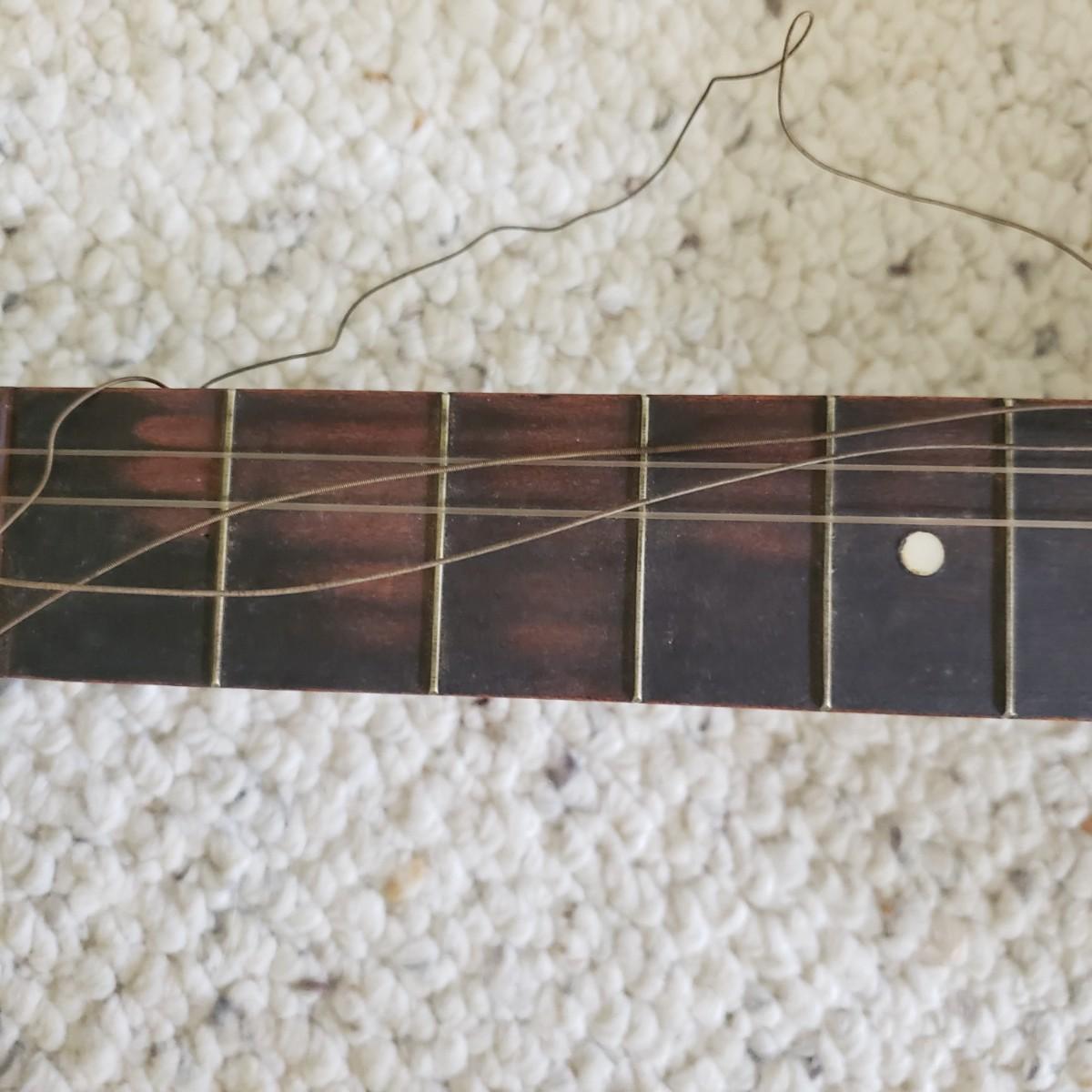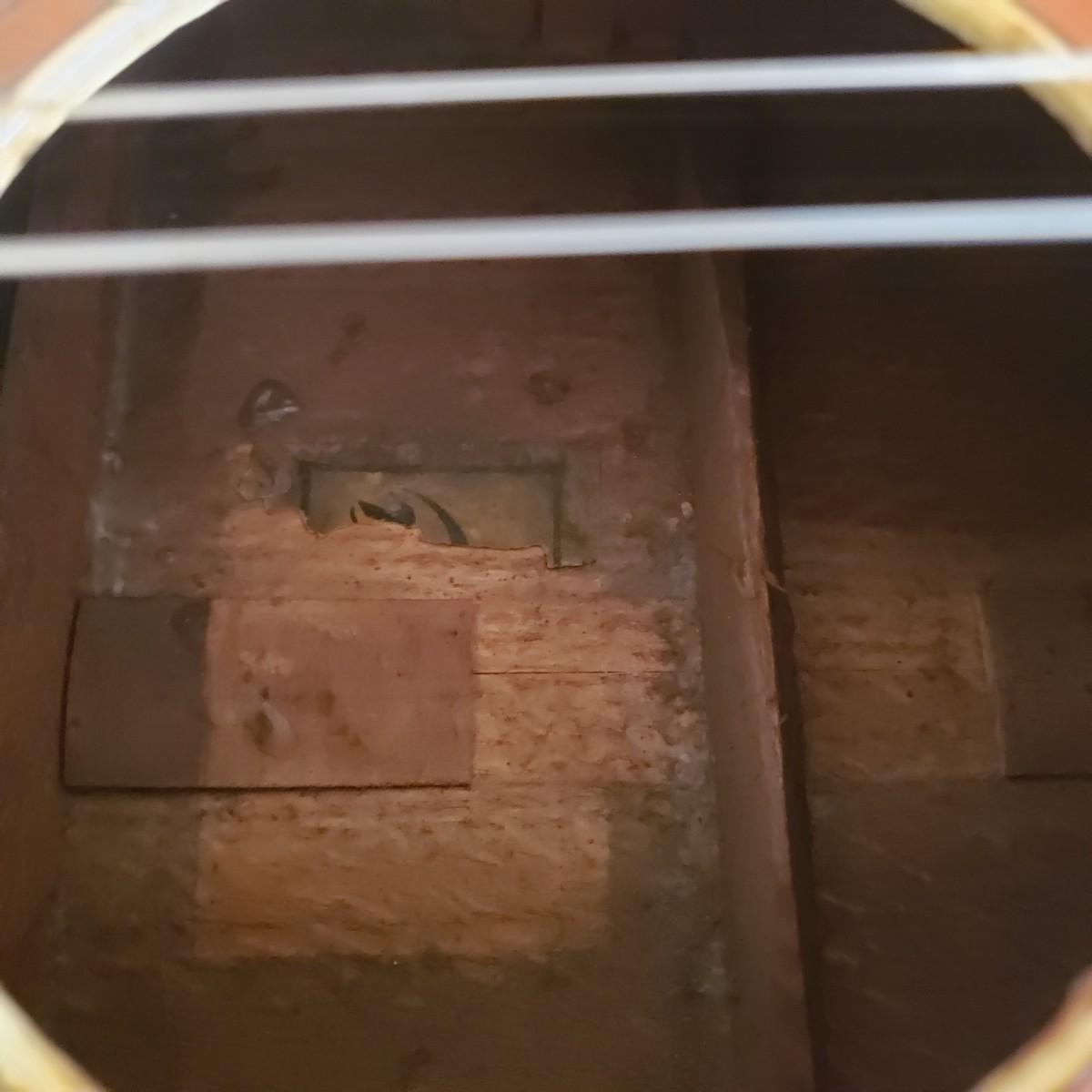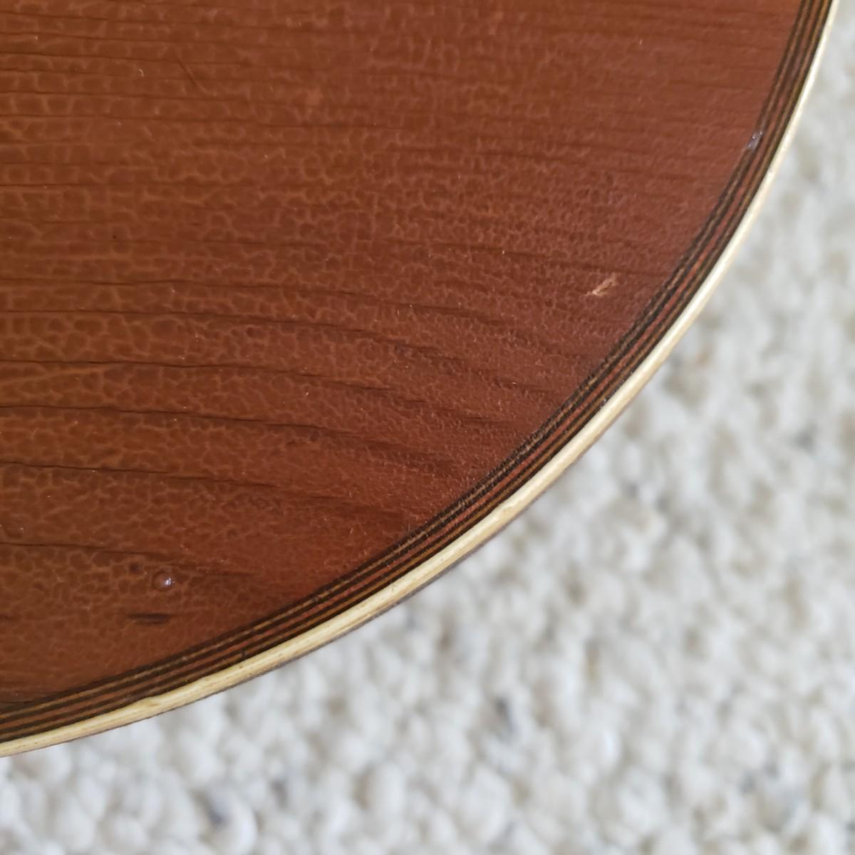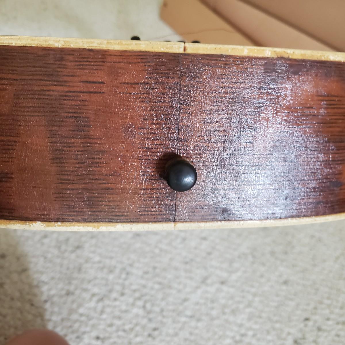 This lot features an acoustic guitar with unknown origin, as the label on the inside is torn off, yet there is a small piece left, see pictures. Due to its age it has some worn musical love on the finish. Comes in an unmarked cardboard box. The guitar measures 37" long. The body measures 18" x 14" x 3.5"H.