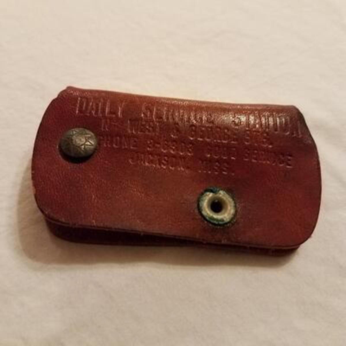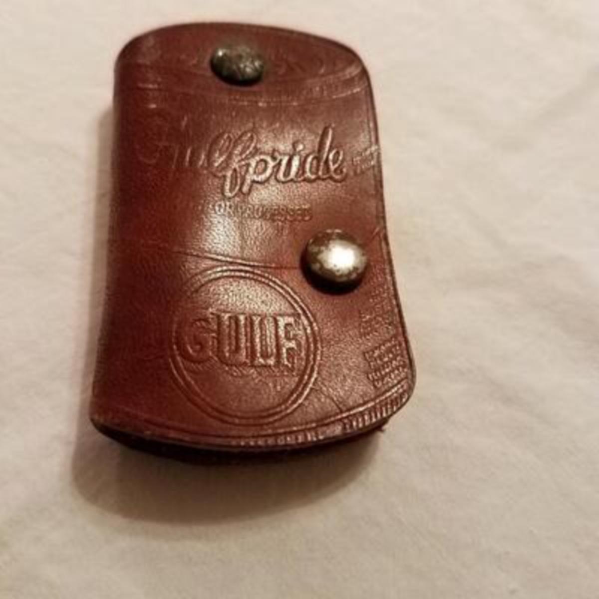 Vintage Gulfpride Leather Keyholder. It is in the shape of a Gulf oil can. The back reads “Daily Service Station N. West & George STS Phone 3-6303 Good Service Jackson, Miss” In excellent condition. 2 keys included. I did not open it to take pictures of the inside.