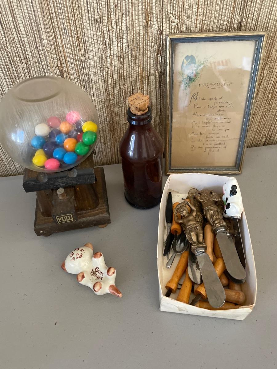 Butter spreaders, bottle, gum holder and gumballs with friendship pic